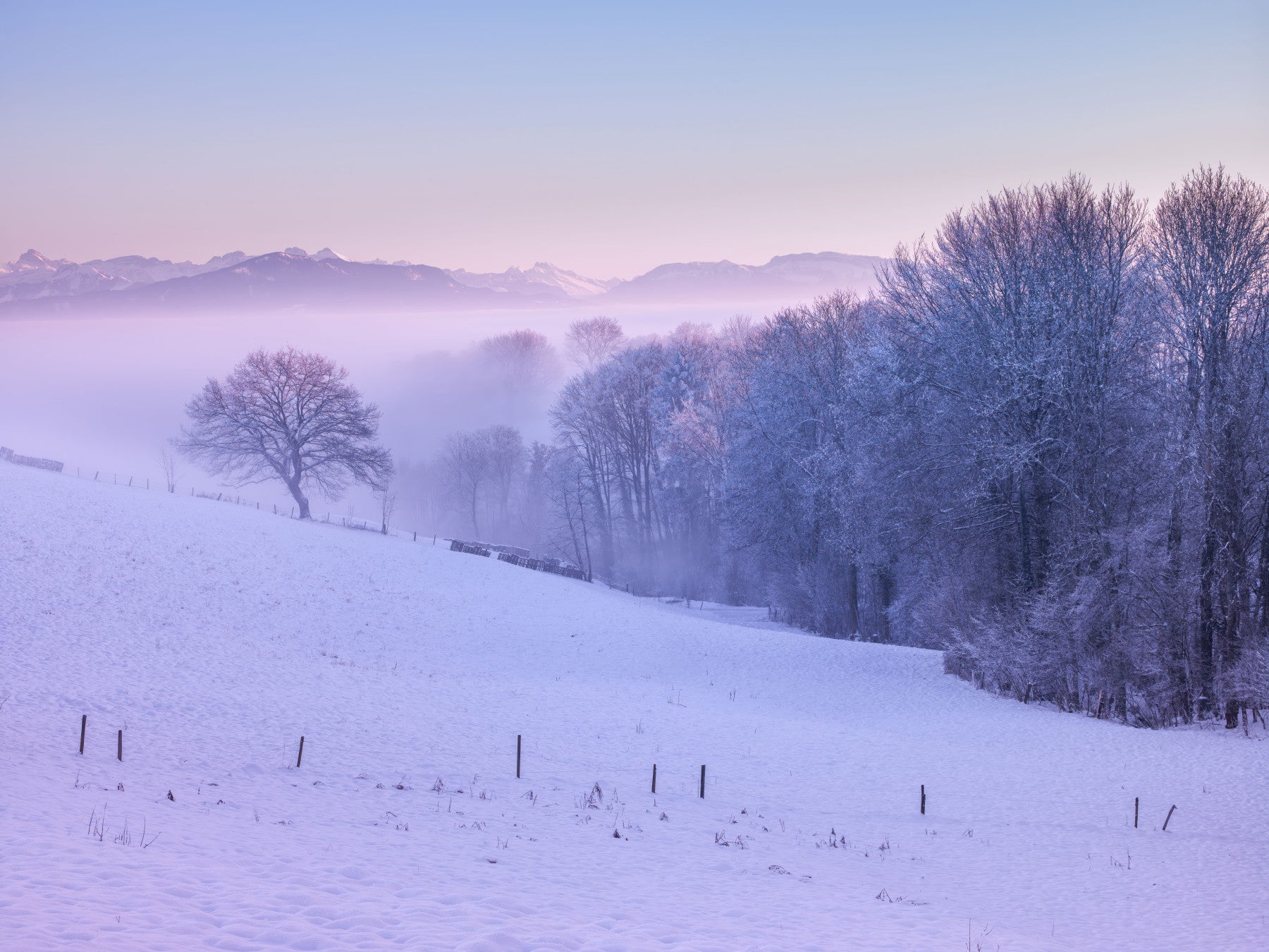 Snowy winter landscape mural featuring frosted trees and distant mountains.
