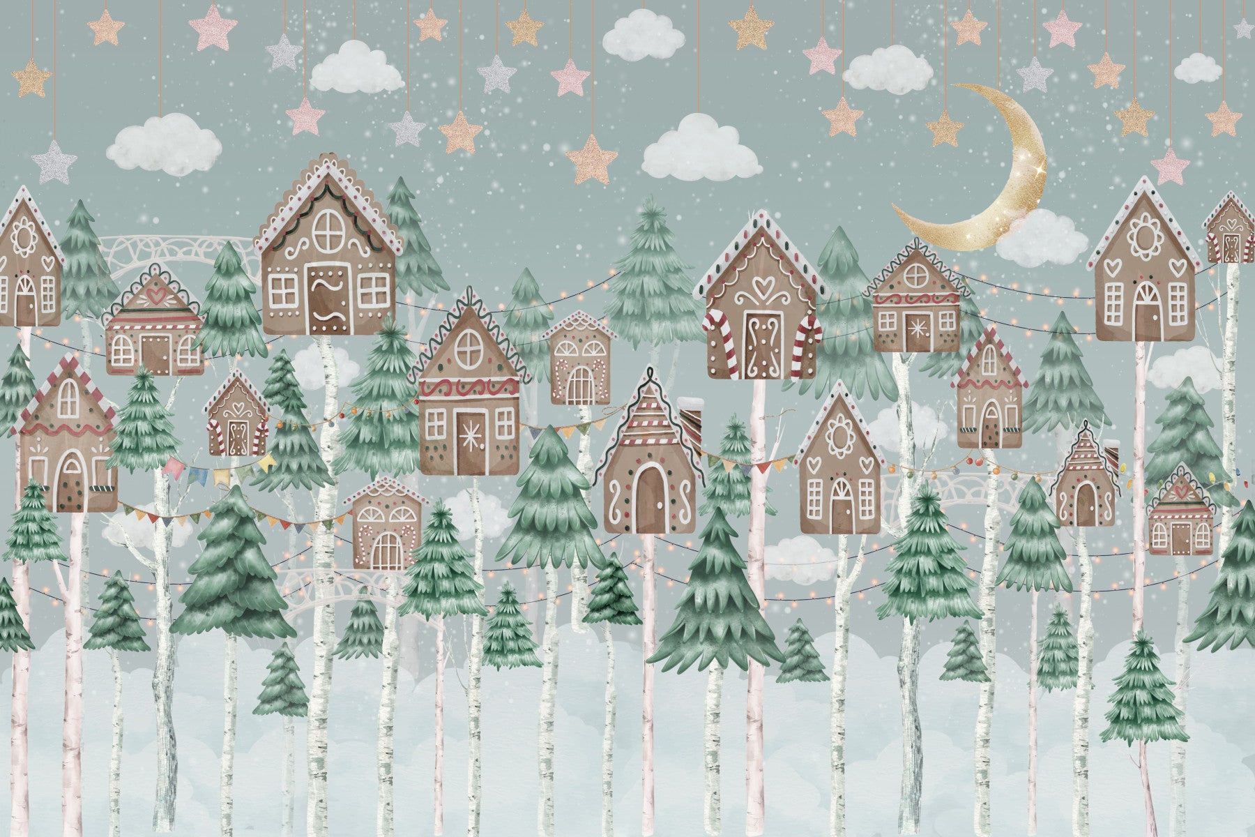 Create a cozy retreat with this enchanting wallpaper. The design showcases delightful gingerbread homes scattered throughout a snowy birch forest under a starry sky. The soft color palette of pastel greens, browns, and creams evokes a serene winter ambiance. This wallpaper for walls brings warmth and whimsy to any room. Perfect for creating a magical nursery, a cozy bedroom, or a festive living area. The delicate details add an artistic touch to interiors.