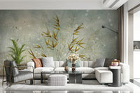 Bring a touch of serenity to your home with this delicate botanical design. Fine, golden wisps dance across a soft, textured background, offering a tranquil and organic feel. It blends subtle shades of beige, pale blue, and gold to create a calm atmosphere. Use this wallpaper for walls in bedrooms, living rooms, or hallways to cultivate a serene ambiance. Its neutral palette ensures it pairs well with various interior styles.