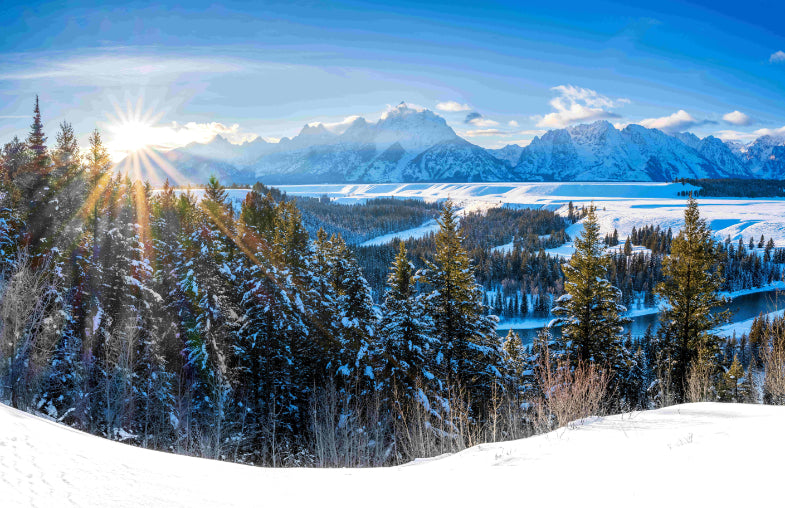 Our Wyoming winter wall mural is a celebration of pristine wilderness, a stunning nature and landscape wallpaper that encapsulates the tranquil beauty of the Teton range under a snow-white blanket. This white wallpaper is a testament to the serene, untouched splendor of nature, inviting a sense of calm and reflection. It's perfect for those who appreciate the quiet majesty of a winter's landscape, bringing the outdoor serenity indoors. With every glance, find yourself whisked away to the peaceful, snowy peaks, a sight that promises to inspire and refresh the soul with its natural elegance.