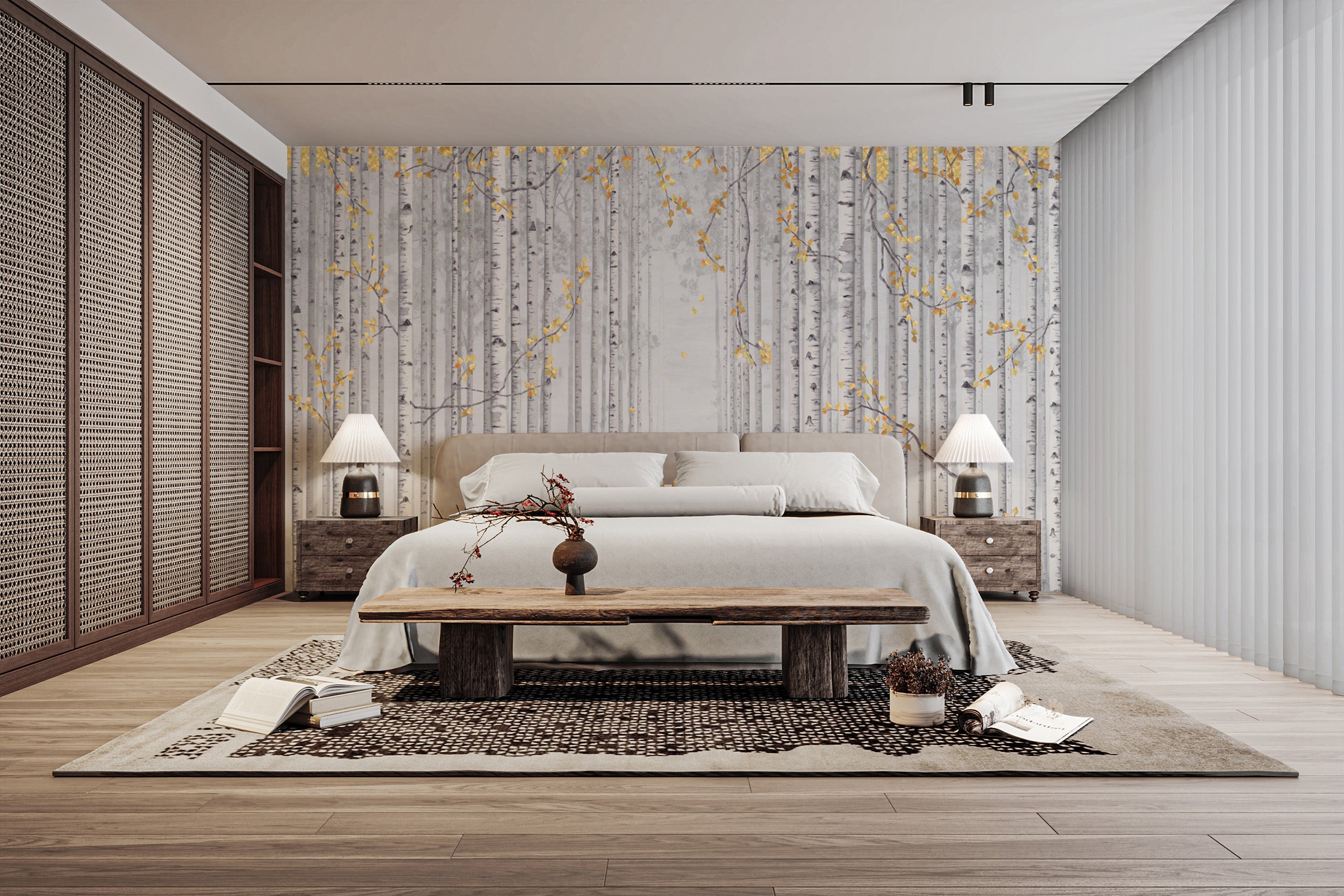 Minimalist birch trees mural with yellow leaf accents