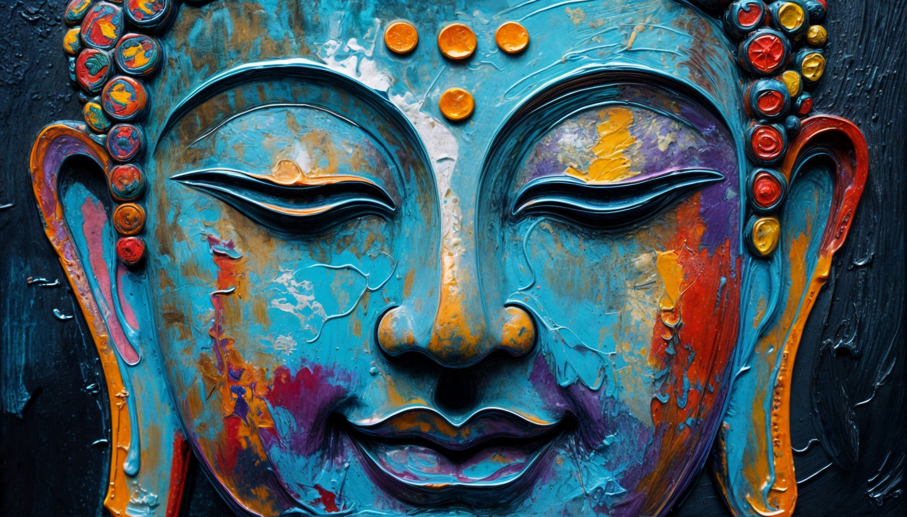 Introduce a sense of calm and contemplation to your living spaces with this striking wallpaper for walls. This design showcases the serene face of Buddha rendered in a textured, artistic style. Bold brushstrokes of turquoise, orange, purple, and touches of yellow combine to create a vibrant yet harmonious color palette. The intricate details invite quiet reflection, making it ideal for meditation spaces, bedrooms, or living rooms. Enhance your home with this calming and thought-provoking statement piece. It effortlessly complements modern, eclectic, and zen-inspired interiors.