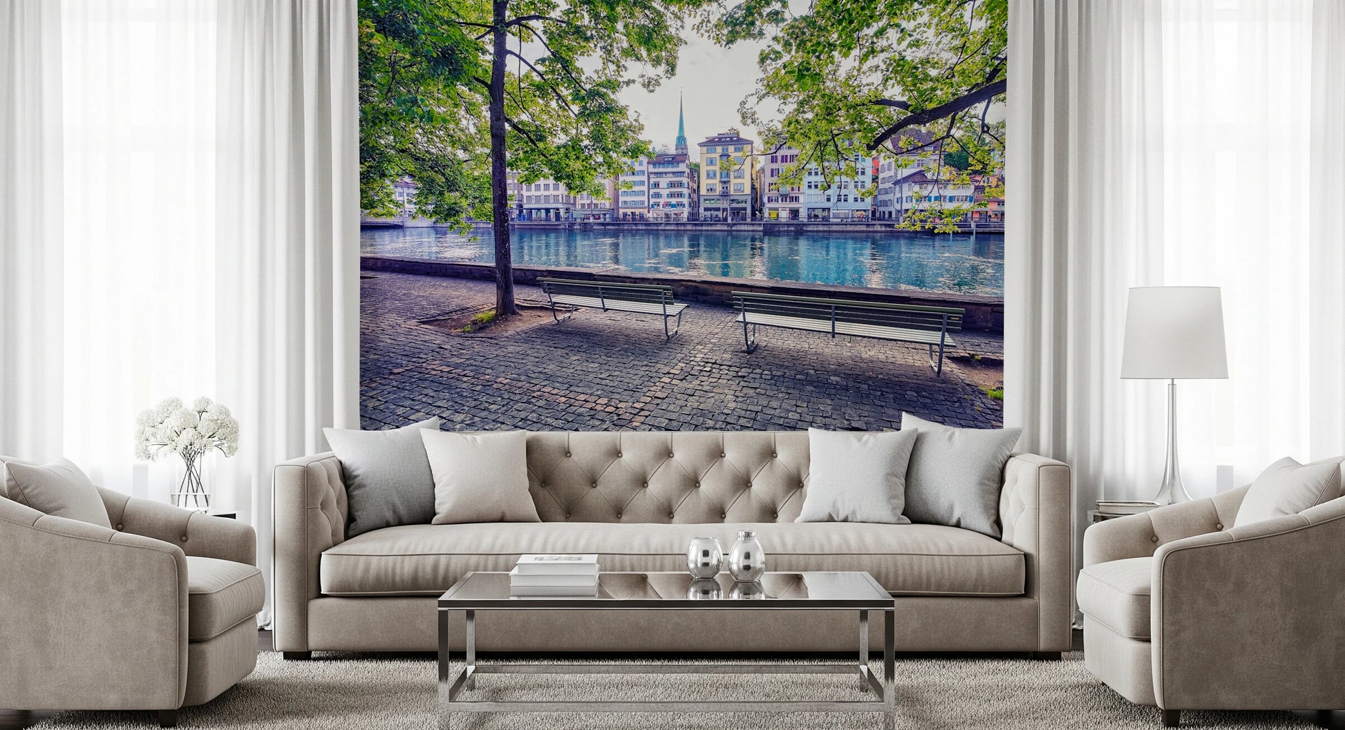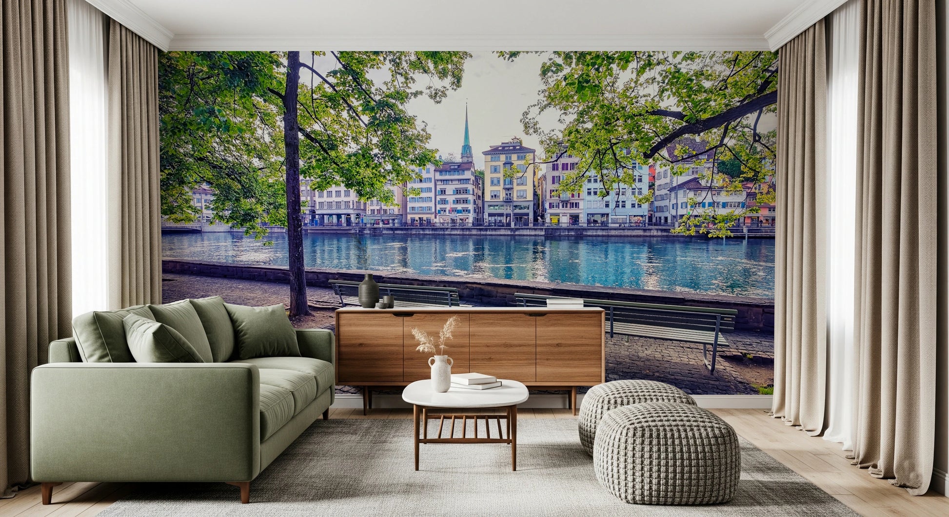 Transform your walls with this serene view of Zurich's Limmat River. This wallpaper for walls captures the essence of a tranquil day with its sparkling blue waters and charming buildings. Lush green trees frame the scene, creating a peaceful, outdoor vibe perfect for living rooms, bedrooms, or even a home office. The cobblestone path adds a touch of rustic charm. This design complements a variety of interior styles, from modern minimalist to classic European, and brings a breath of fresh air into any space.