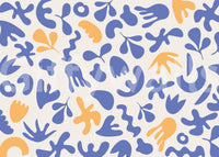 Este papel de parede envolvente para paredes apresenta um design cativante de formas orgânicas e fluidas, reminiscentes dos recortes inspirados em Matisse. Uma paleta calma de azul pervinca suave e damasco delicado dança sobre um fundo quente em branco sujo. As formas irregulares e fluidas criam um ritmo visual dinâmico, mas harmonioso, trazendo um toque artístico e moderno a qualquer espaço interior. Este design adiciona uma sensação convidativa de fantasia e sofisticação. Perfeito para iluminar uma sala de estar, adicionar uma brincadeira serena a um quarto de bebé ou infantil, ou criar uma parede de destaque inspiradora num escritório criativo em casa. Complementa facilmente vários estilos de decoração, desde o minimalismo contemporâneo a uma estética mais eclética, realçando a divisão com a sua textura visual única e cores suaves.