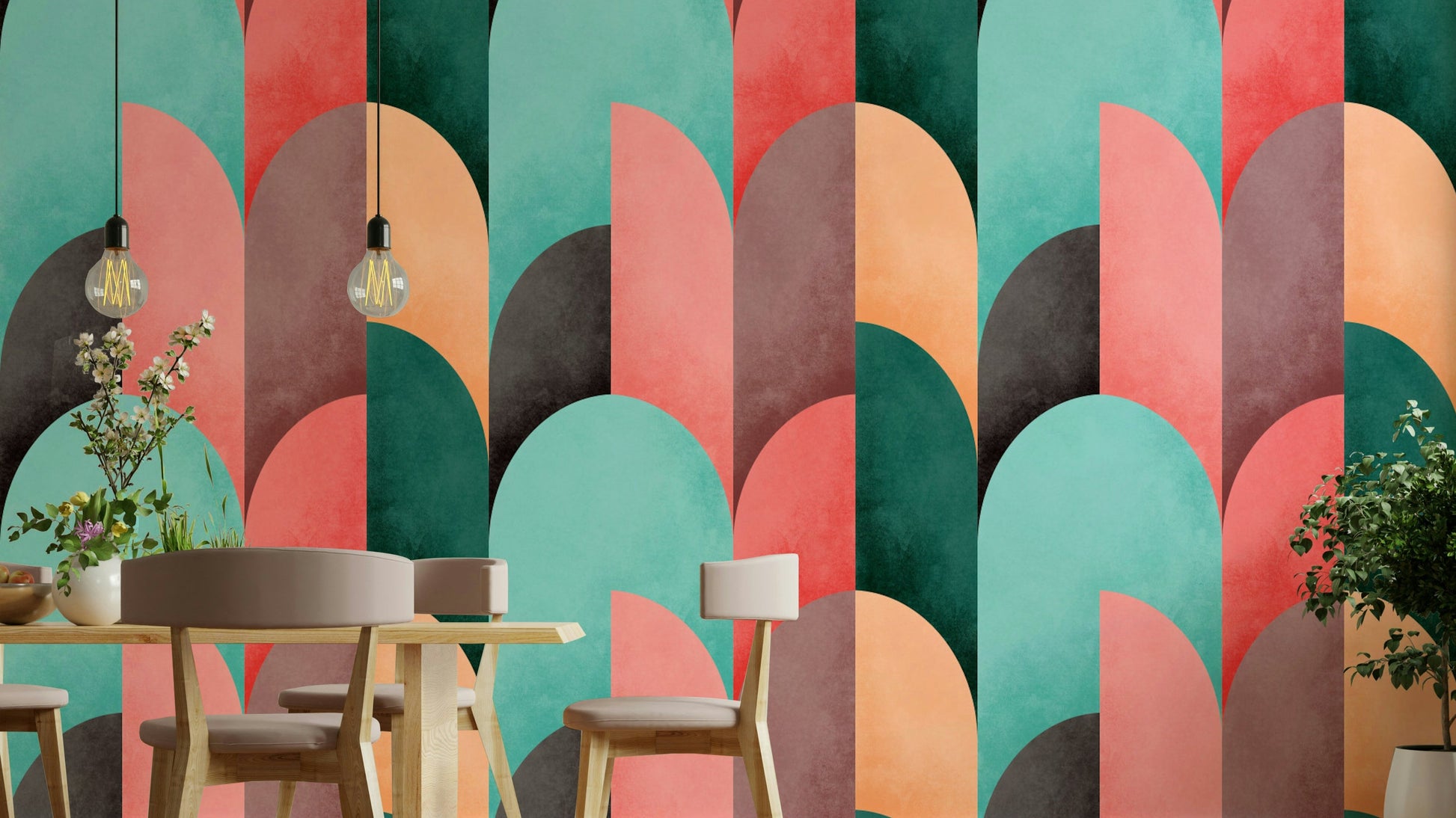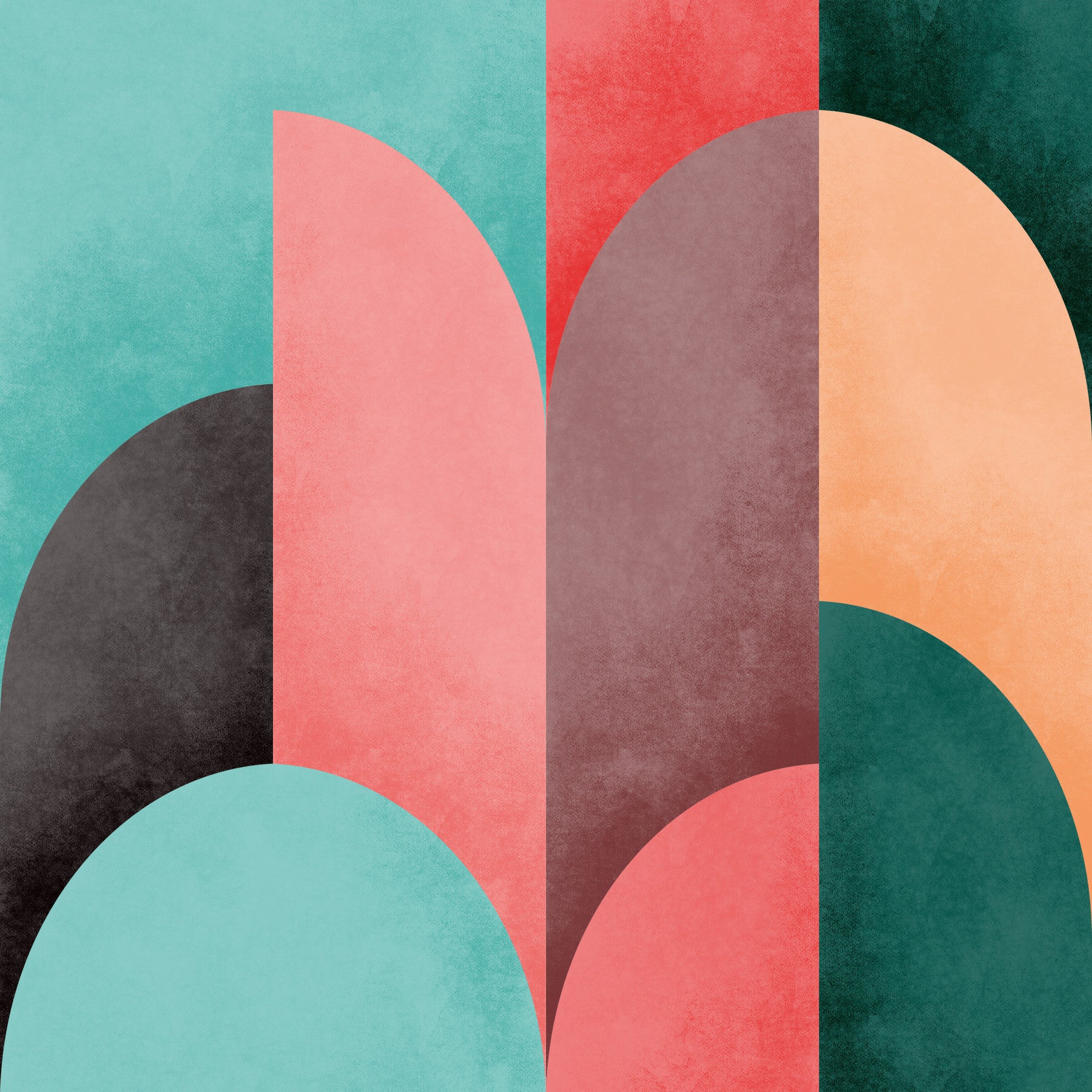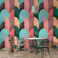 Evoke a sense of retro-chic tranquility with the "Mid Mod Geometry Sunrise" wallpaper. This design blends the clean lines and geometric shapes characteristic of mid-century modern aesthetics with the warm, optimistic hues of a rising sun. Semi-circular segments in muted coral, peach, teal, and deep earth tones intersect and overlap, creating a visually captivating yet calming composition. The subtle texture overlay adds depth and a tactile feel, enhancing the wallpaper's overall sophistication. Perfect for adding a touch of vintage elegance and a splash of welcoming color to any space, "Mid Mod Geometry Sunrise" offers a refreshing take on classic design, promising to brighten your walls and elevate your mood with its harmonious blend of form and color.