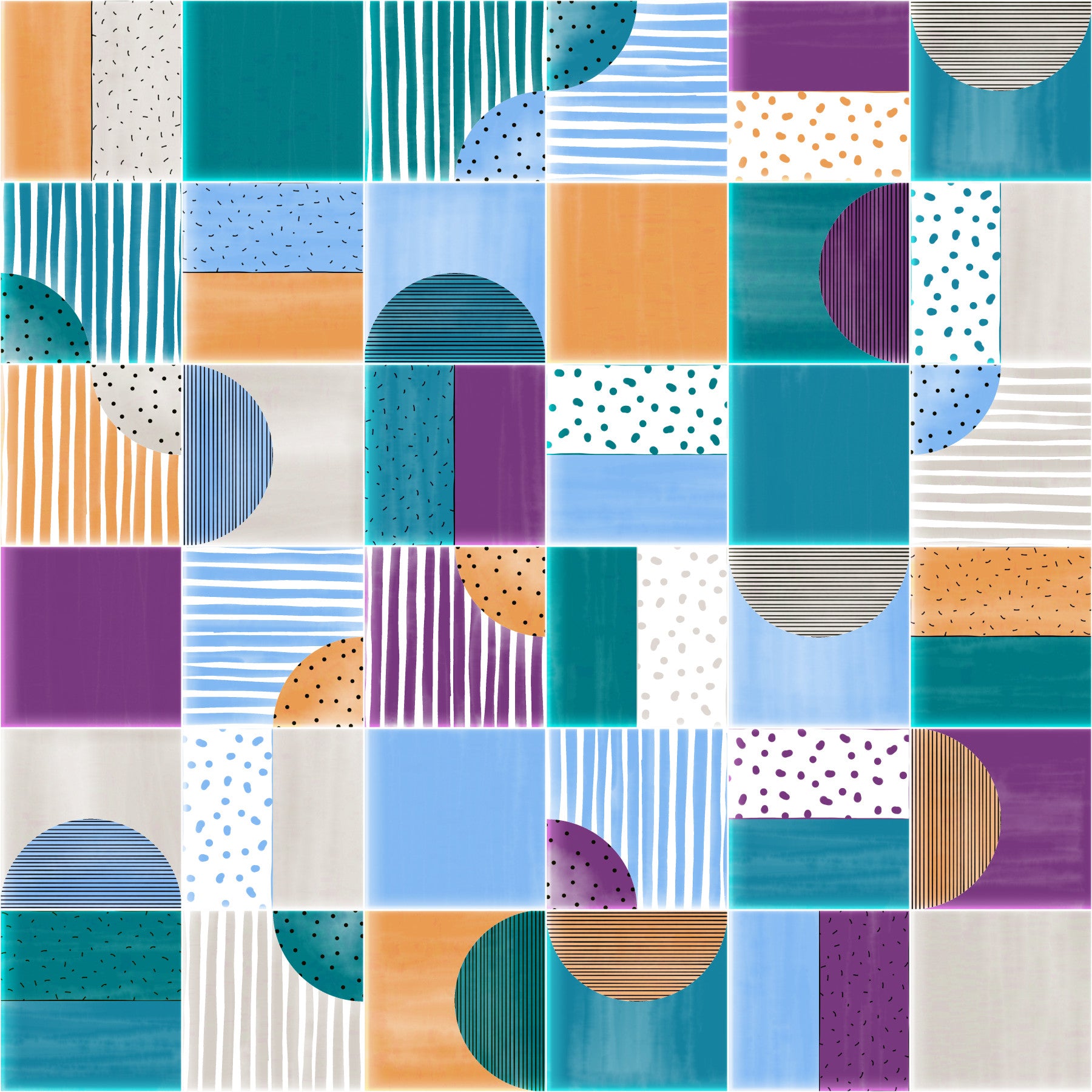 Dive into the vibrant energy of our Painted Modern Tiles Summer Party wallpaper. This design is a playful collage of contemporary geometric patterns and hand-painted textures. Bold blocks of teal, azure, orange, and a touch of vibrant purple are juxtaposed with whimsical stripes, polka dots, and semi-circles creating a dynamic and cheerful visual experience. Evoking the carefree spirit of summer, this wallpaper features a watercolor-like aesthetic, bringing a touch of artistic charm to any space. The imperfect lines and hand-drawn elements add a unique character, reminiscent of sun-drenched afternoons and festive gatherings. Transform your walls into a celebration of modern design and summery vibes with this eye-catching and joyful wallpaper. It's the perfect backdrop for creating a space that's both stylish and full of life, year-round.