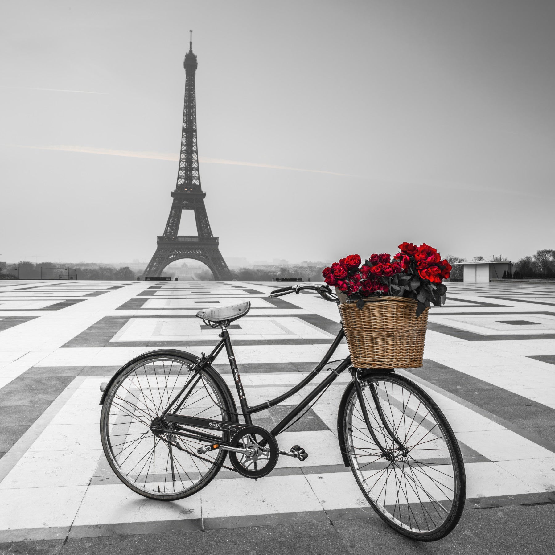Bicycle with a basket of roses next to the Eiffel tower. Capture the essence of romance with 'Parisian Love Story,' a stunning wallpaper that transports you to the heart of Paris. A classic bicycle, its wicker basket overflowing with vibrant red roses, stands elegantly against the backdrop of the iconic Eiffel Tower shrouded in a soft, grey mist. The monochrome palette, punctuated by the burst of crimson blooms, creates a captivating contrast, symbolizing the vibrant passion found amidst the timeless beauty of the city.