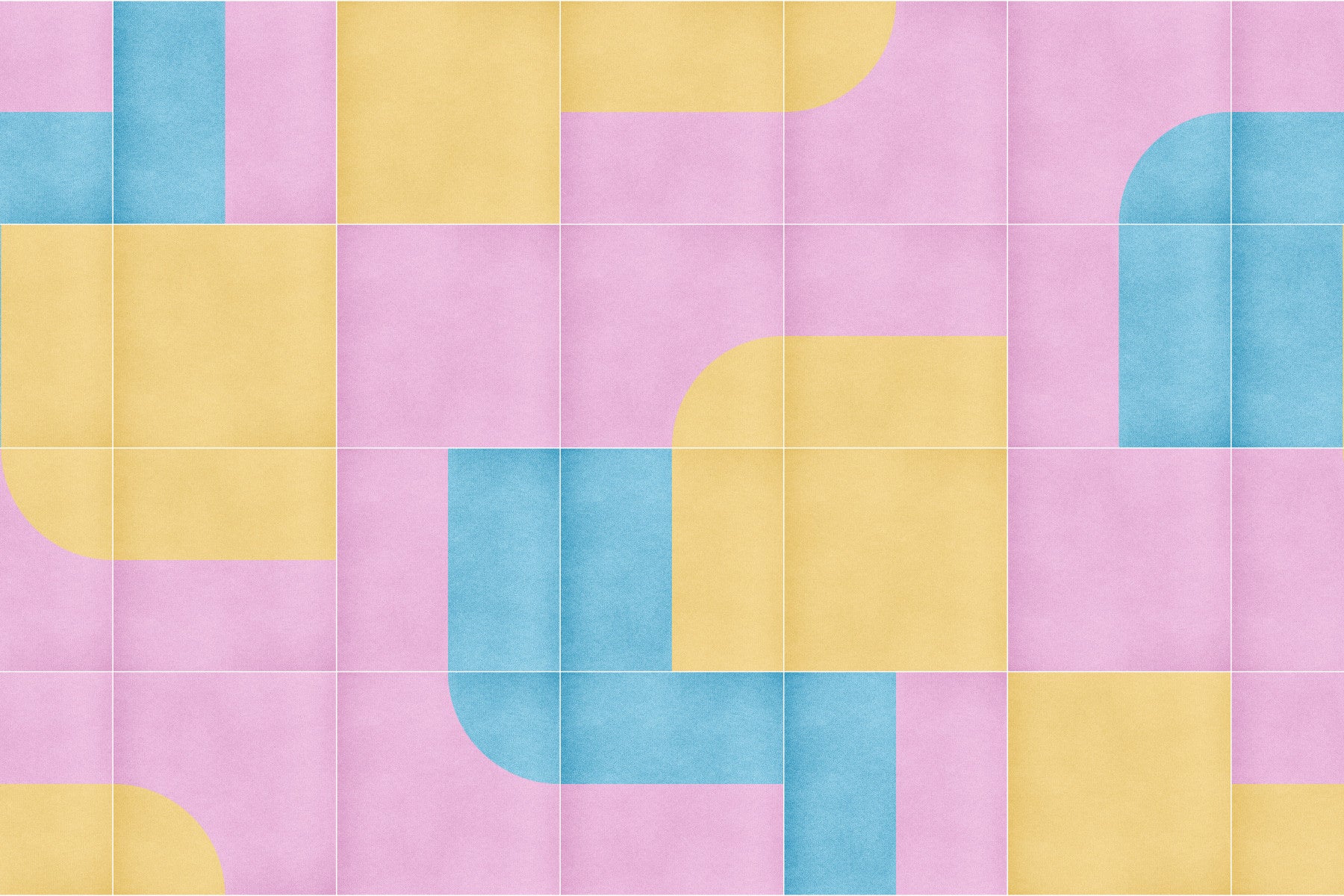 Step back in time with Retro Tiles 10 a wallpaper that channels the playful spirit of mid-century modern design. This eye-catching pattern features a geometric grid of squares in a delightful palette of pastel pink, sunny yellow, and serene blue. The clean lines and thoughtfully placed quarter-circle motifs create a sense of balance and harmony, evoking a feeling of nostalgic charm. Imagine a sun-drenched kitchen from the 1960s, or a groovy living room decorated with bold, optimistic patterns. 'Retro Tiles 10' brings that vintage aesthetic to your screen, adding a touch of whimsy and style to any device. With its soft textured effect, this wallpaper adds warmth and personality, making it an ideal choice for anyone seeking a cheerful and timeless backdrop.