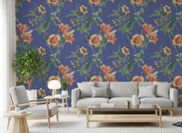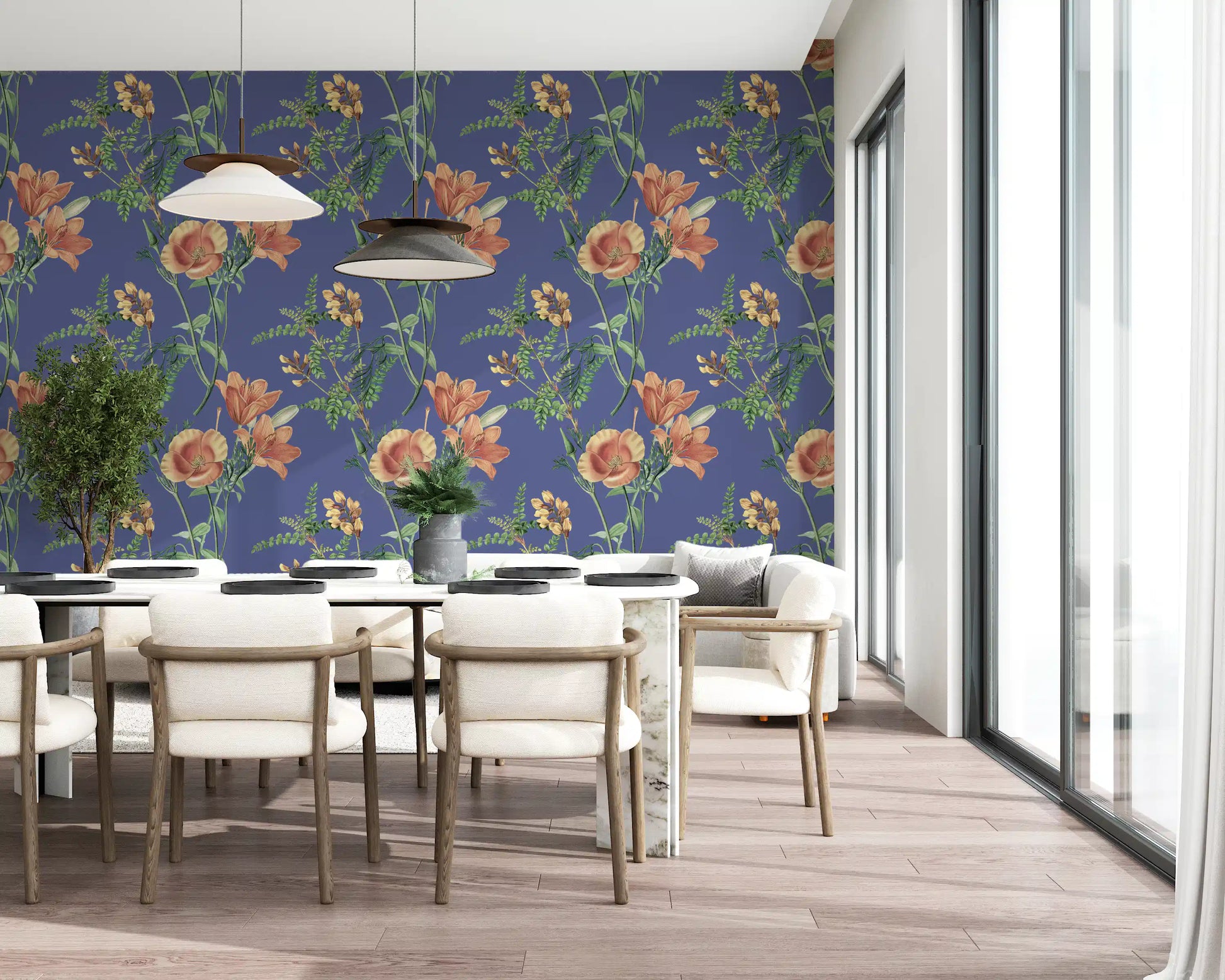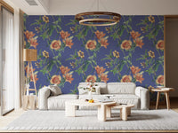 Îmbogățiți-vă interiorul cu acest tapet rafinat pentru pereți, care prezintă ilustrații botanice vintage detaliate. Crini portocalii coral luxuriant și flori delicate galben auriu se desfășoară printre un tapet de frunziș verde variat, toate pe un fundal liniștitor albastru periwinkle închis. Acest design clasic aduce o notă sofisticată, amintind de o placă botanică de colecționar. Transformă orice încăpere, adăugând căldură și artă naturală. Imaginați-vă acest model captivant în living, sufragerie sau un dormitor liniștit, creând o atmosferă primitoare. Acest design ridică nivelul decorului, transformând pereții obișnuiți într-o oază de grădină liniștită. Paleta sa bogată de culori și detaliile complexe completează atât stilurile tradiționale, cât și pe cele eclectice.