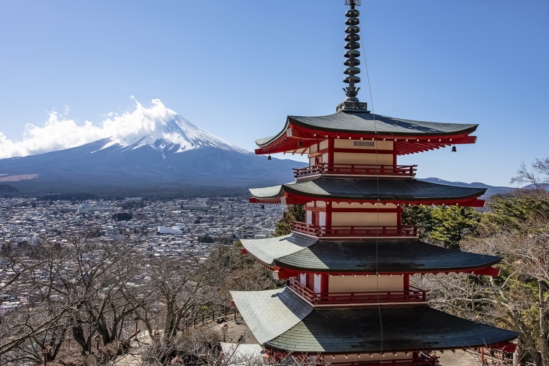 Traditional Chureito Pagoda Fuji Vista wallpaper mural for rooms.