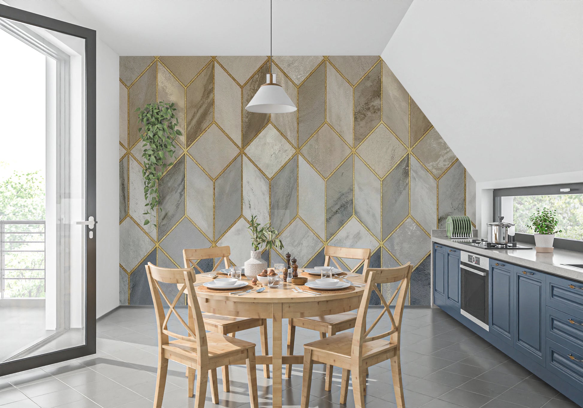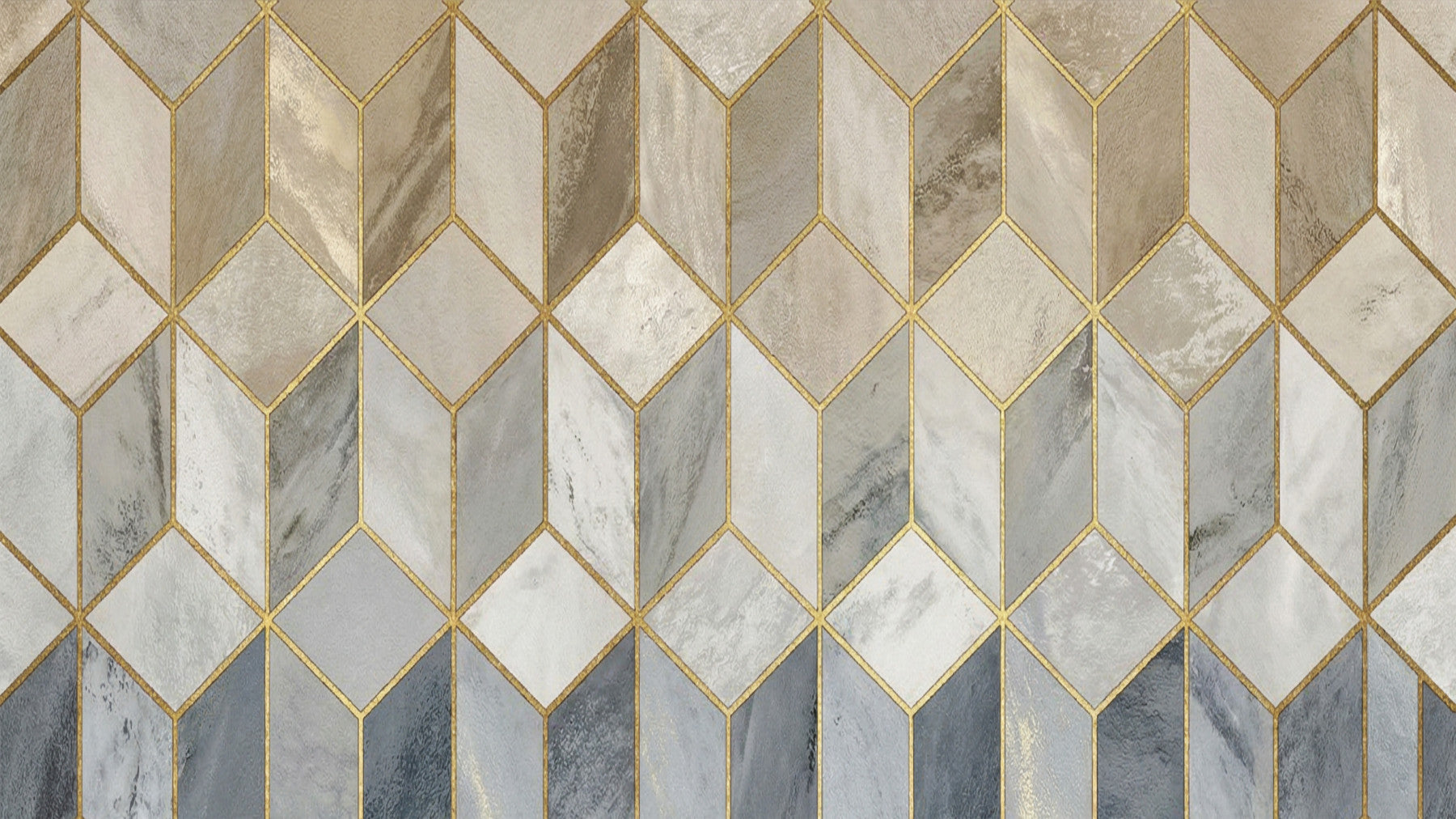 Introduceți o notă de geometrie modernă în casa dvs. cu acest tapet sofisticat pentru pereți. Designul prezintă un model de cuburi de piatră interconectate, conturate cu linii aurii strălucitoare. Paleta de culori îmbină griuri delicate, cremuri și bejuri, creând o estetică calmă și neutră. Acest tapet se potrivește deosebit de bine în camere de zi, sufragerii sau holuri, adăugând profunzime și interes vizual. Oferă o senzație de lux, completând în același timp diverse stiluri interioare, de la contemporan la clasic. Înnobilați-vă spațiul cu acest decor de perete elegant, geometric.