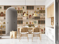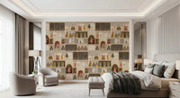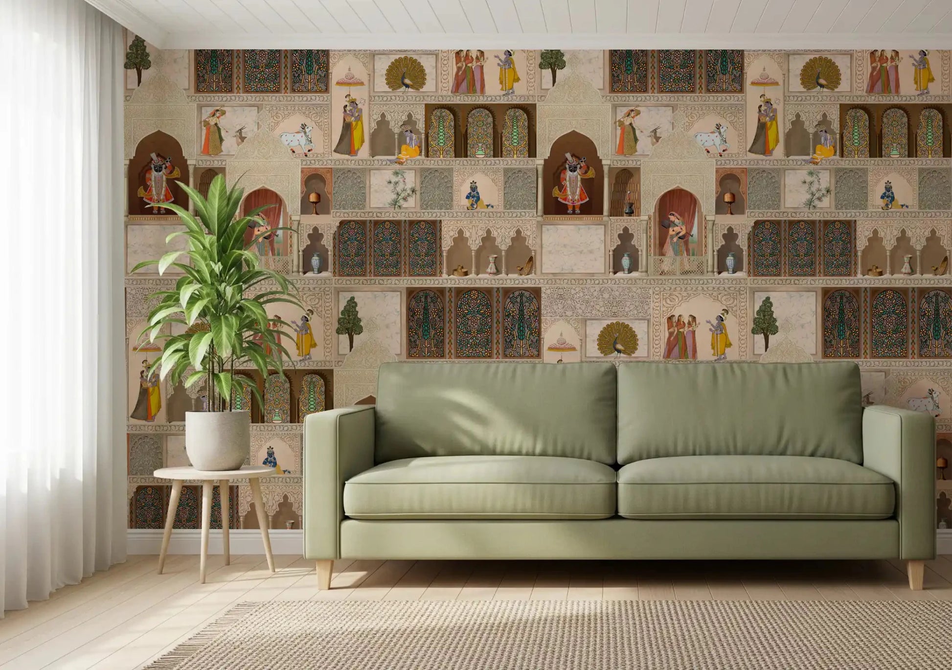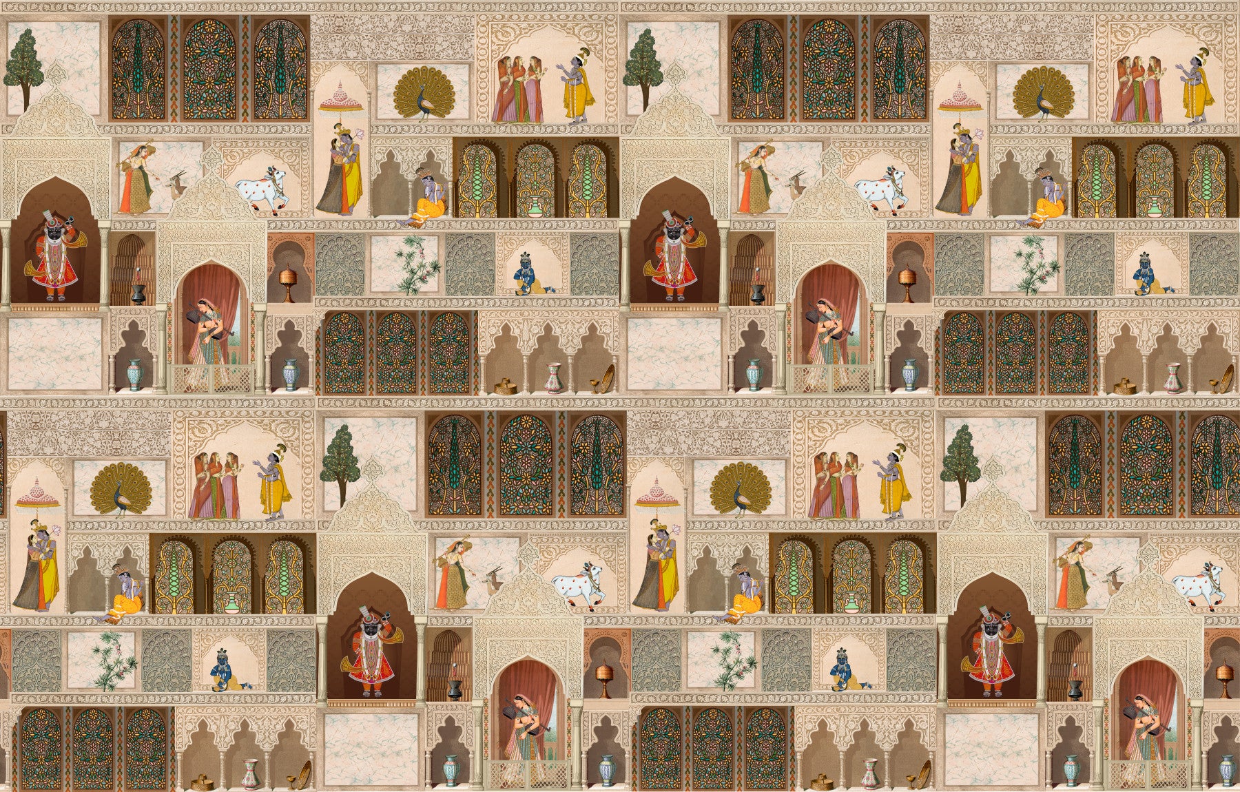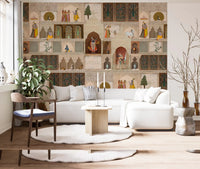 Transformă-ți spațiul de locuit cu acest tapet rafinat, inspirat din narațiunea unui palat indian, pentru pereți. Acest design prezintă o tapiserie bogată de picturi miniaturale complexe, care prezintă zeități precum Krishna, păuni, vaci și figuri regale, în mijlocul arcadelor și ferestrelor arhitecturale ornamentate. Stilul tradițional și detaliile meticuloase creează un sentiment de grandoare istorică și profunzime artistică. Paleta sa caldă de bej, bej și maro, accentuată cu stropi vibrante de roșu, albastru, verde și auriu, infuzează camerele cu o atmosferă opulentă, dar senină. Acest tapet se potrivește perfect ca o piesă de rezistență într-un living, o sufragerie sau un birou sofisticat, adăugând bogăție culturală și o notă de eleganță regală oricărui interior.