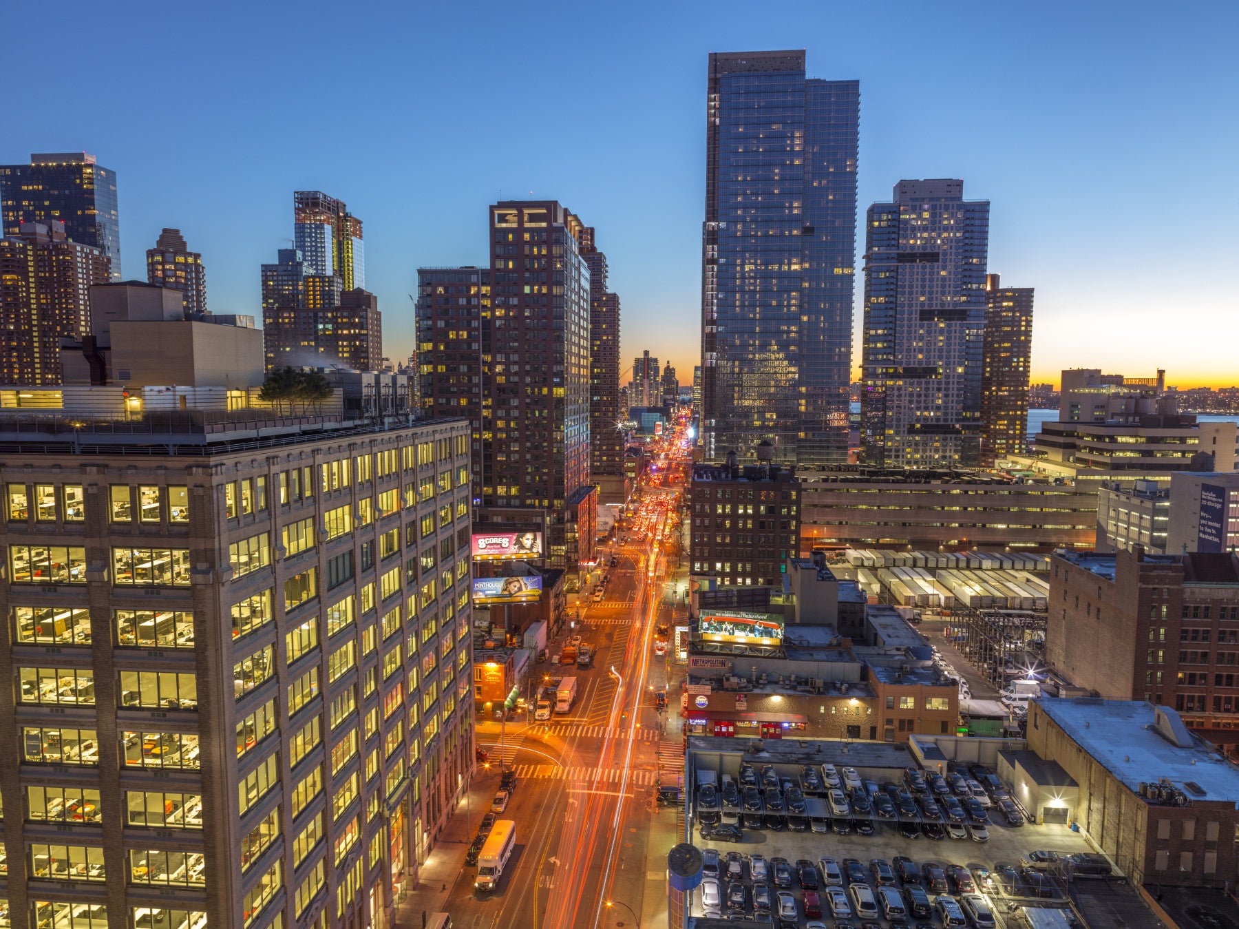 The image shows a sweeping panoramic view of a modern metropolis as the sun sets.