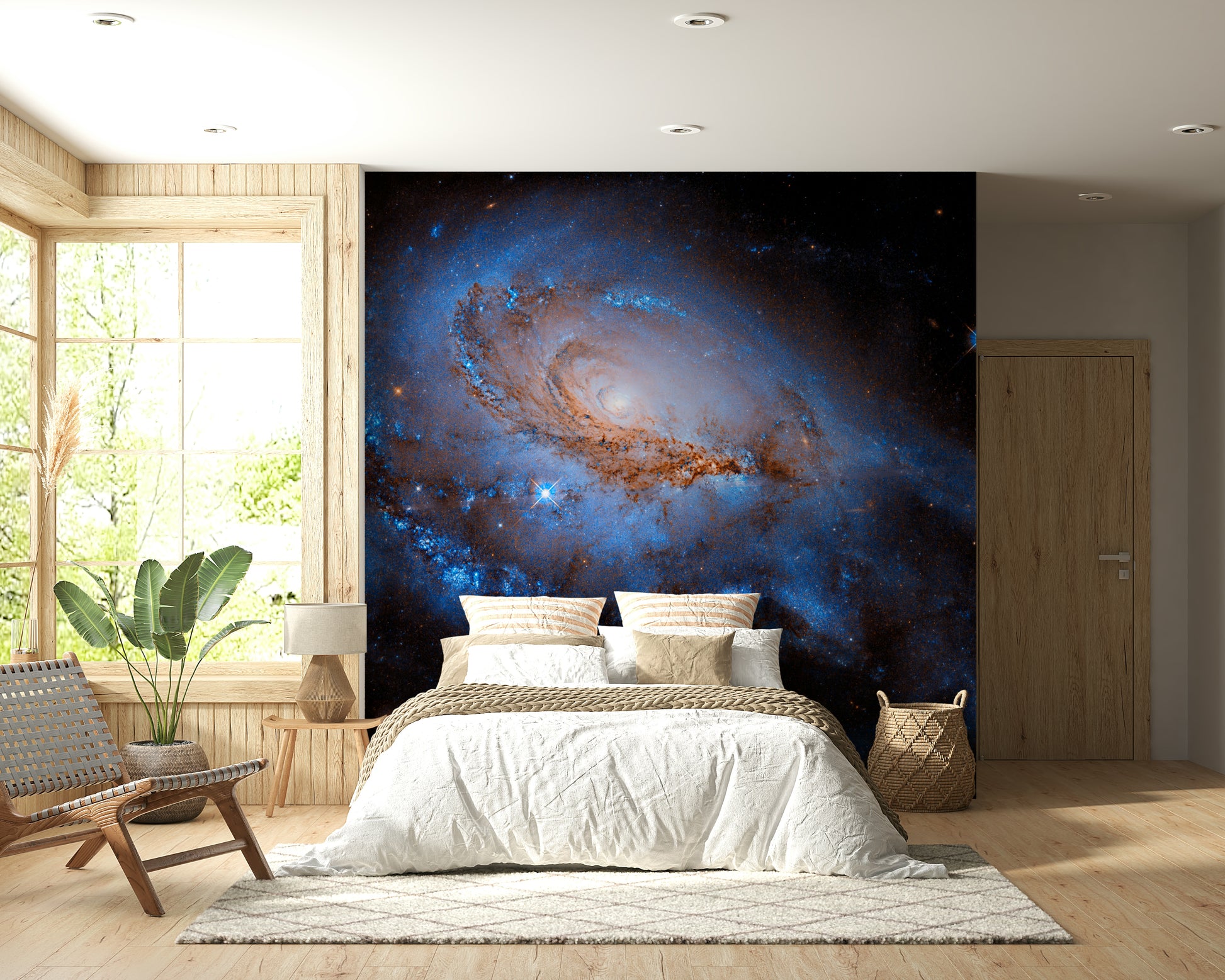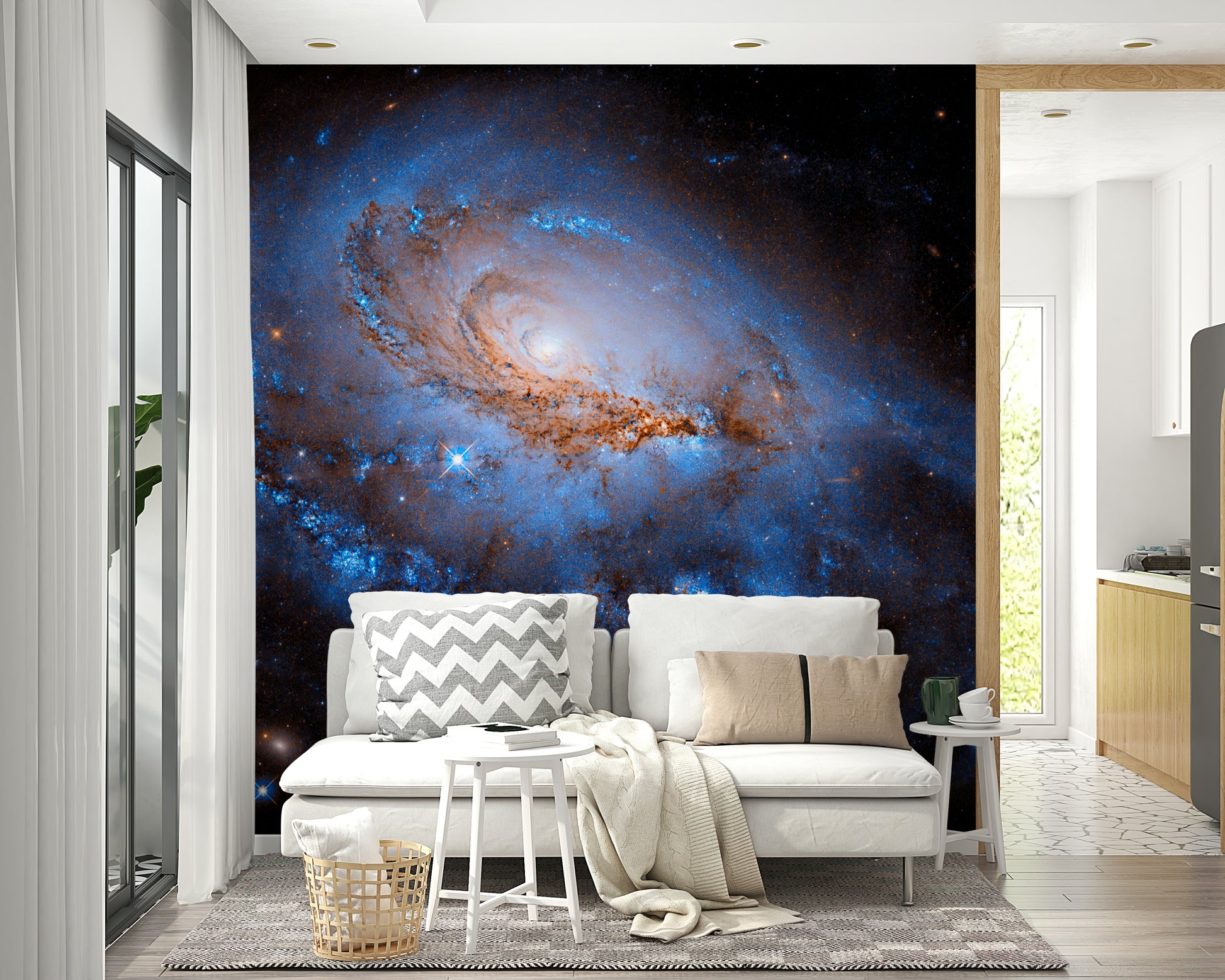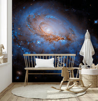 Înnobilează-ți interiorul cu această reprezentare uluitoare a unei galaxii îndepărtate, perfectă ca tapet pentru pereți. Acest design prezintă nebuloase învolburate în nuanțe de albastru intens și portocaliu aprins, creând un efect vizual captivant. Adaugă profunzime și o senzație de vastitate oricărei camere, fiind o alegere excelentă pentru spațiile în care dorești să inspiri imaginația sau să creezi o atmosferă calmă. Imaginează-l într-un dormitor, o sufragerie sau chiar un birou de acasă, unde servește drept fundal uimitor, completat de mobilier modern. Adu frumusețea spațiului cosmic înăuntru și urmărește cum acest tapet îți transformă spațiul cu culori și lumini dramatice.