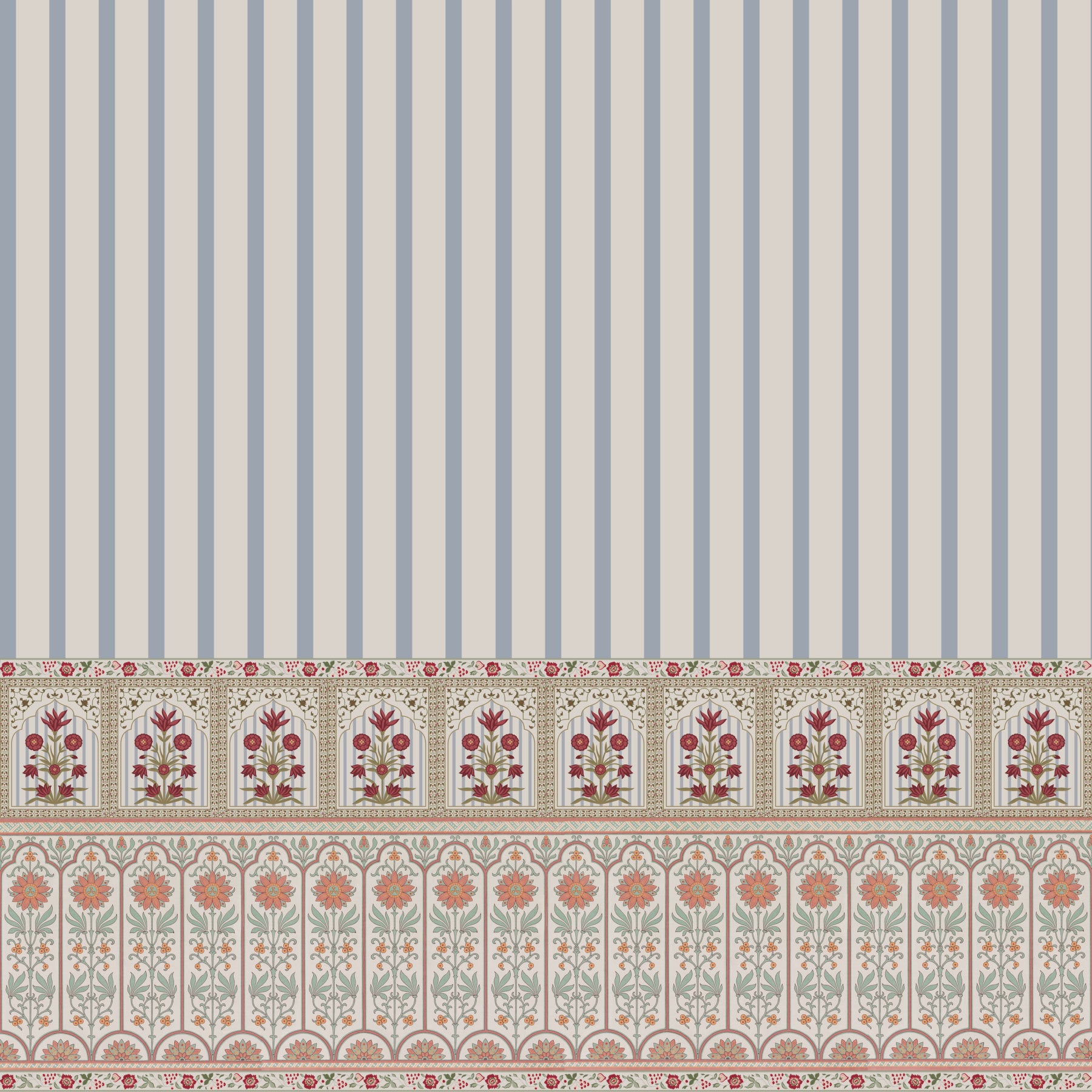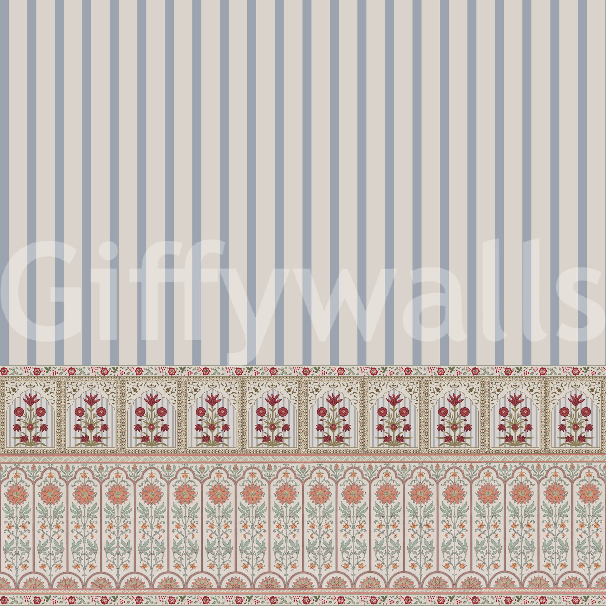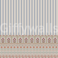 Elevate your walls with this refined, traditional design. Soft, dusty blue stripes accent detailed floral patterns in coral and burgundy. The design brings a calming elegance to living rooms, dining rooms, or bedrooms, creating a serene and sophisticated atmosphere. This wallpaper for walls presents an understated yet luxurious aesthetic, perfect for enhancing interiors with subtle color and refined details. Transform your space into a sanctuary of style with this captivating wallpaper.