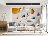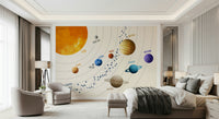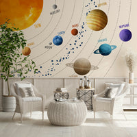 Înfrumusețează-ți interiorul cu acest tapet mural cu sistemul solar. Designul prezintă o ilustrație captivantă în stil acuarelă a soarelui, Pământului și a altor planete, creând un fundal atractiv din punct de vedere vizual și educativ. Nuanțele delicate de albastru, portocaliu și violet pe un fundal neutru îl fac un plus ideal pentru camera copiilor, birou sau spațiu de locuit modern. Designul stârnește curiozitatea și oferă o notă artistică delicată, care completează o varietate de stiluri interioare. Îmbunătățește-ți pereții cu această reprezentare intrigantă și elegantă a vecinătății noastre planetare.