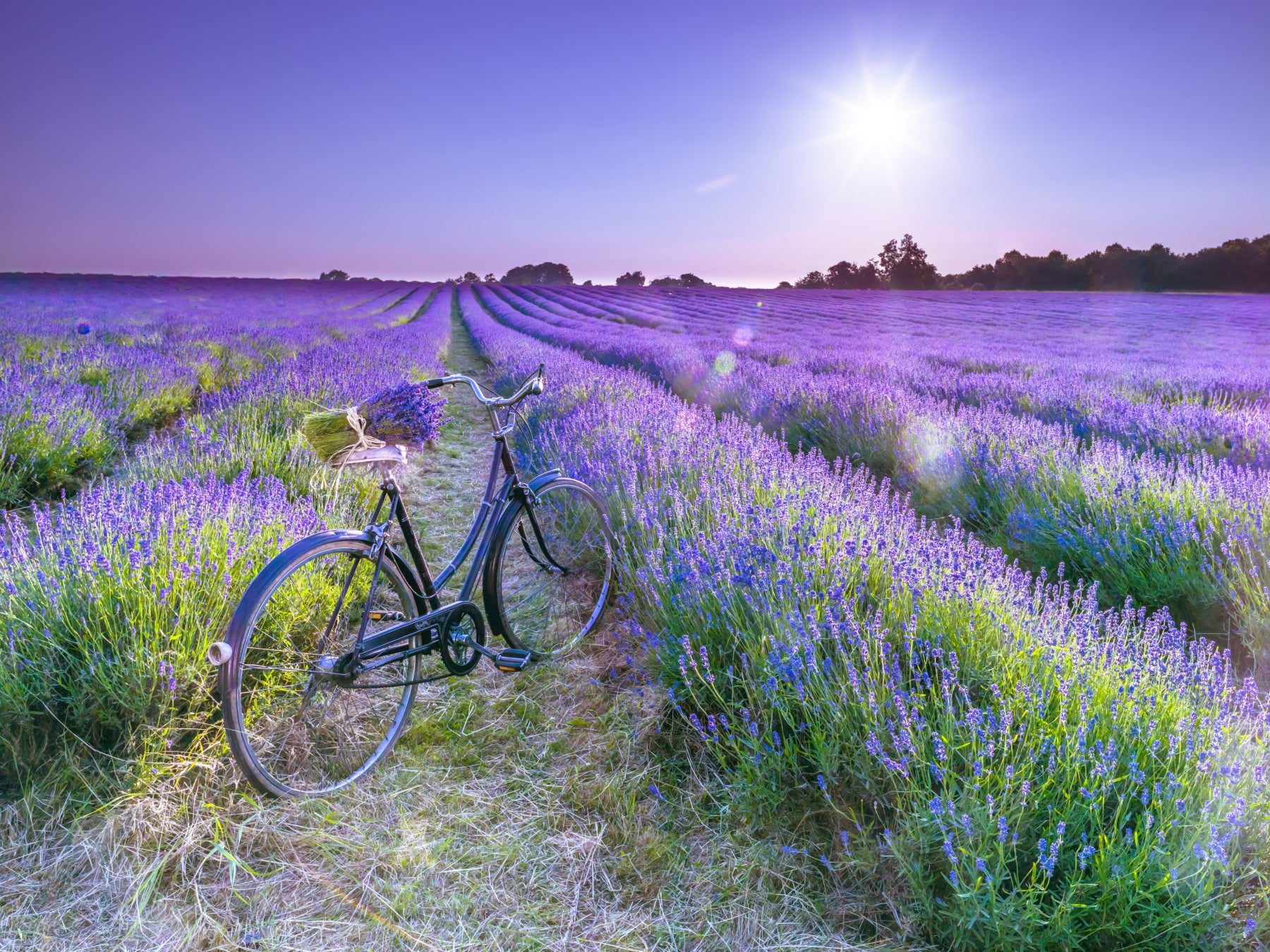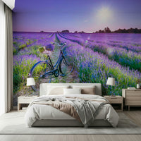 Bicycle with flowers in a Lavender field. Transform your space into a tranquil Provence countryside with this captivating wall décor. Imagine yourself immersed in a seemingly endless field of fragrant lavender, the air filled with its sweet perfume. The gentle rows of vibrant purple blooms stretch towards the horizon, meeting a soft, pastel sky kissed by the warm glow of the sun. A vintage bicycle, laden with freshly picked lavender, rests peacefully in the foreground, inviting you to pause and savor the moment. This stunning piece evokes a sense of calm and serenity, bringing the beauty and tranquility of nature into your home. Let this sunlit lavender escape be a daily reminder to breathe deep, find joy in simple pleasures, and create your own personal sanctuary.