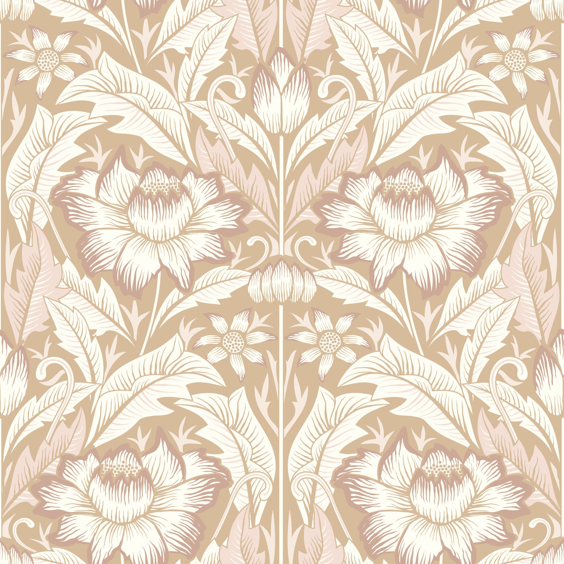 Elegant floral pattern in soft sand beige tones creating a timeless garden wallpaper design.