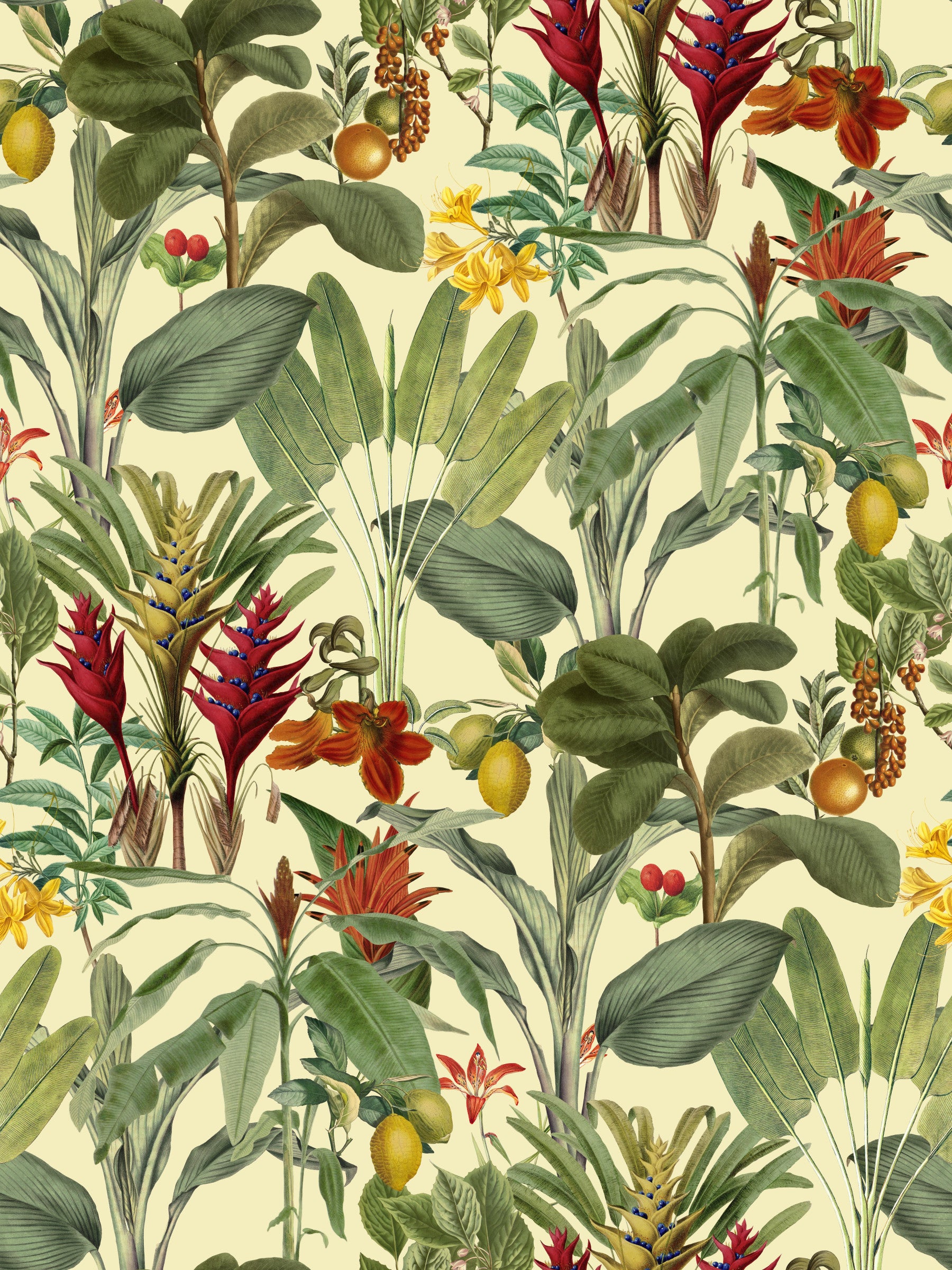 Tapetul Tropical Jungle Garden surprinde frumusețea unui paradis botanic luxuriant, cu frunze, fructe și flori exotice ilustrate manual. Așezat pe o bază crem moale, acesta evidențiază nuanțe vii de verde, galben cald, roșu intens și tonuri de citrice. Frunzișul stratificat și flora detaliată creează o estetică îndrăzneață, dar clasică, a junglei, perfectă pentru zonele de luat masa, camerele de zi sau spațiile boutique. Acest tapet transformă orice cameră într-un refugiu tropical vibrant, menținând în același timp un farmec vintage. Ideal pentru cei care iubesc temele detaliate de grădină și un design de perete plin de viață, care se inspiră atât din natură, cât și din nostalgie.