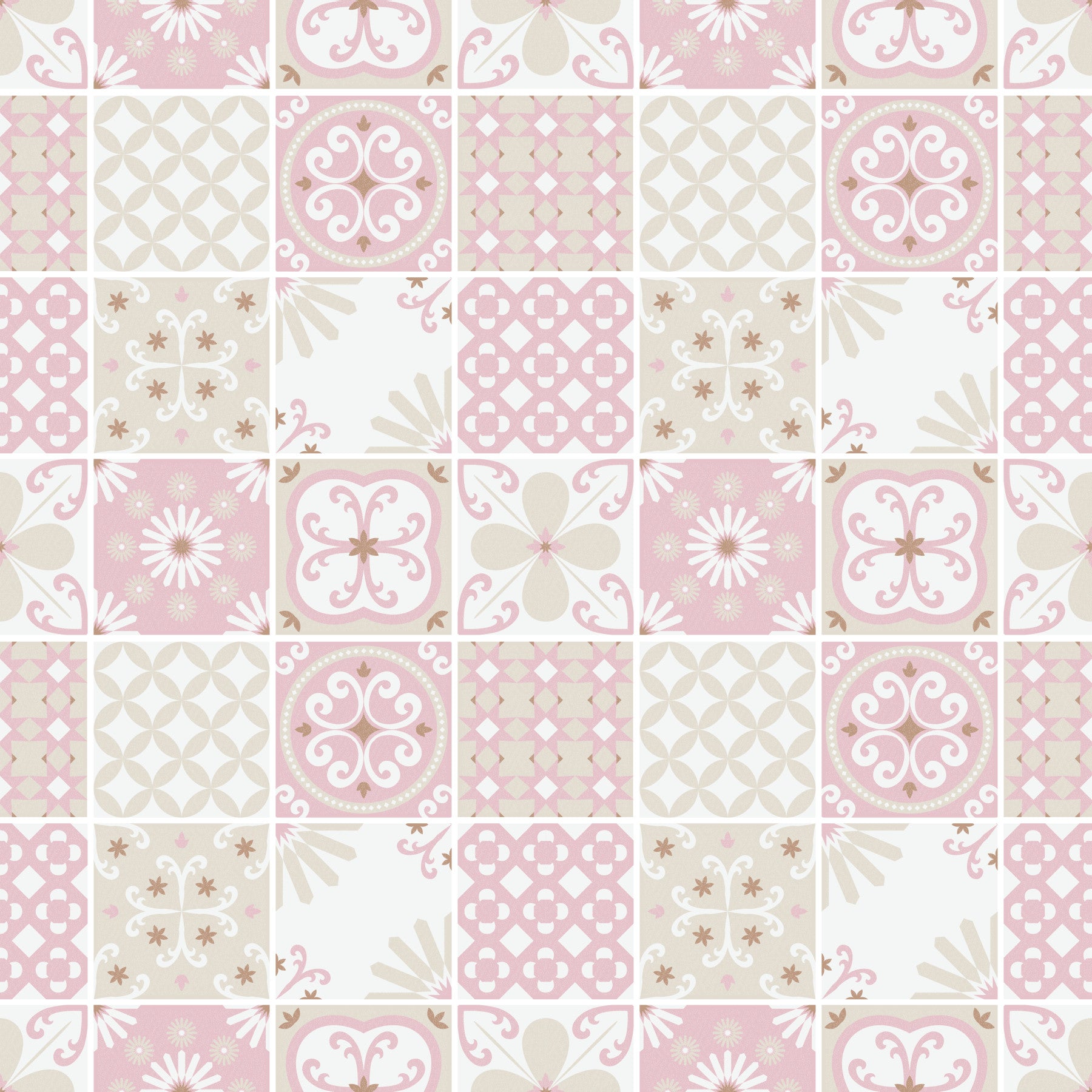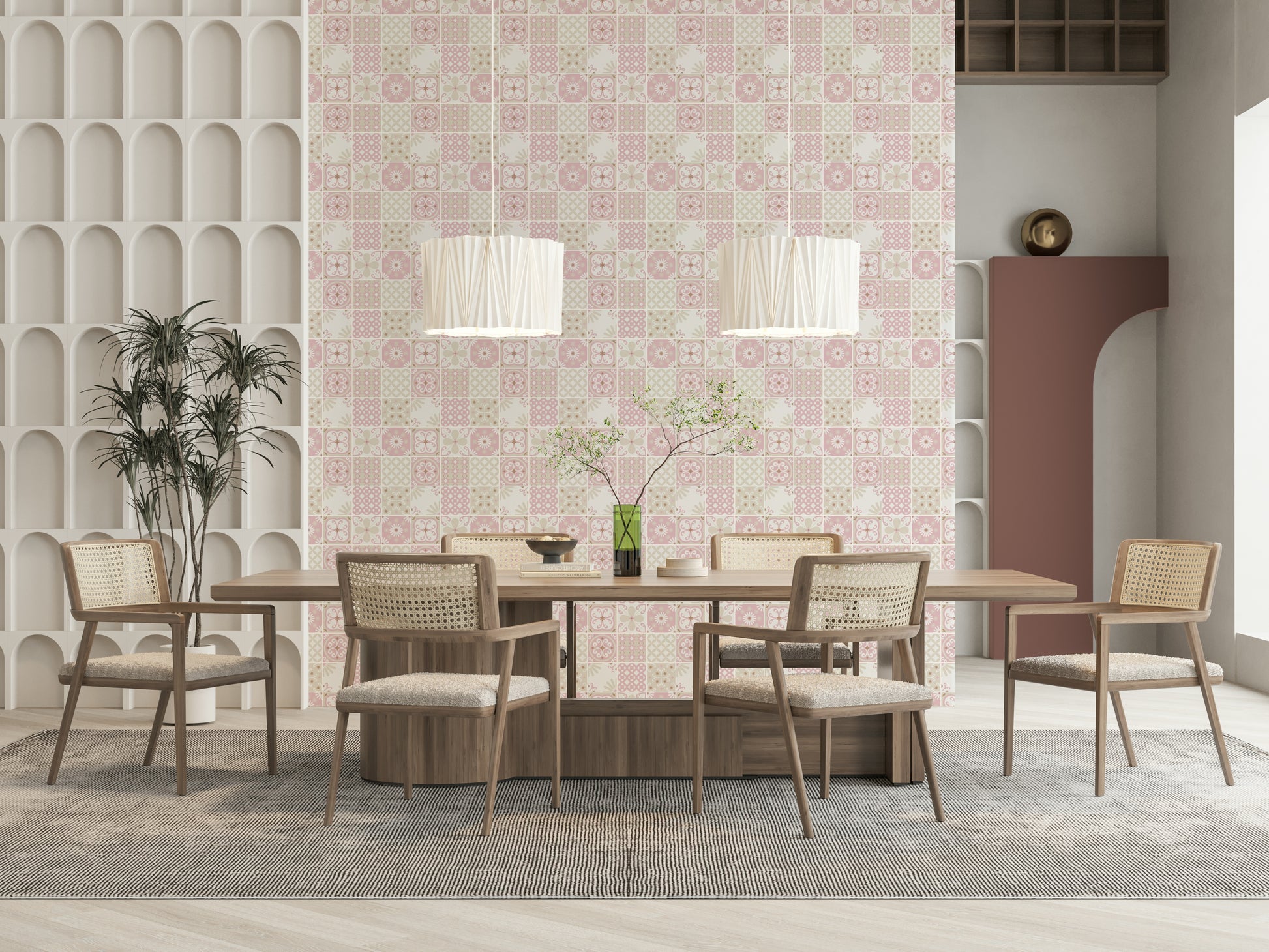 Delicate pink and cream hues highlight the intricate folk patterns in this romantic tile-inspired design. A perfect choice for soft, feminine, and nostalgic spaces.