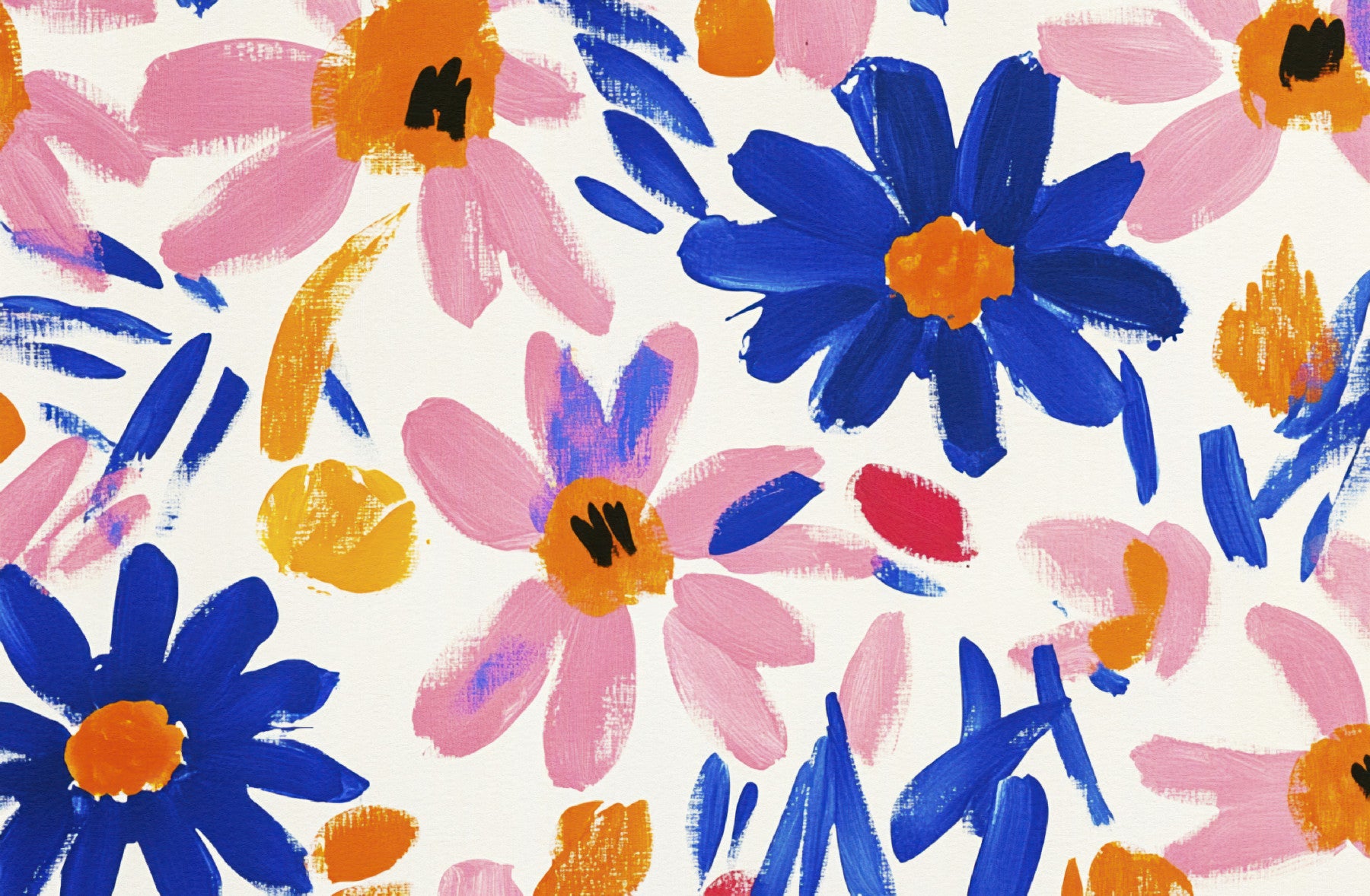 Fördjupa dig i den livliga världen av "abstrakt Matisse Flower Garden." Denna tapet fångar essensen i fauvist modern stil med djärva, icke-naturalistiska färger och förenklade former som påminner om Matisses ikoniska konstverk. Rosa och blå blommor, punkterade med slående orange centra och blad accenter, dans över en lätt bakgrund som skapar en livlig och glad scen. De synliga penseldragarna och den abstrakta kompositionen förbättrar den konstnärliga känslan, vilket gör detta till ett uttalande som ger en touch av modern konst och lekfull energi till alla utrymmen.