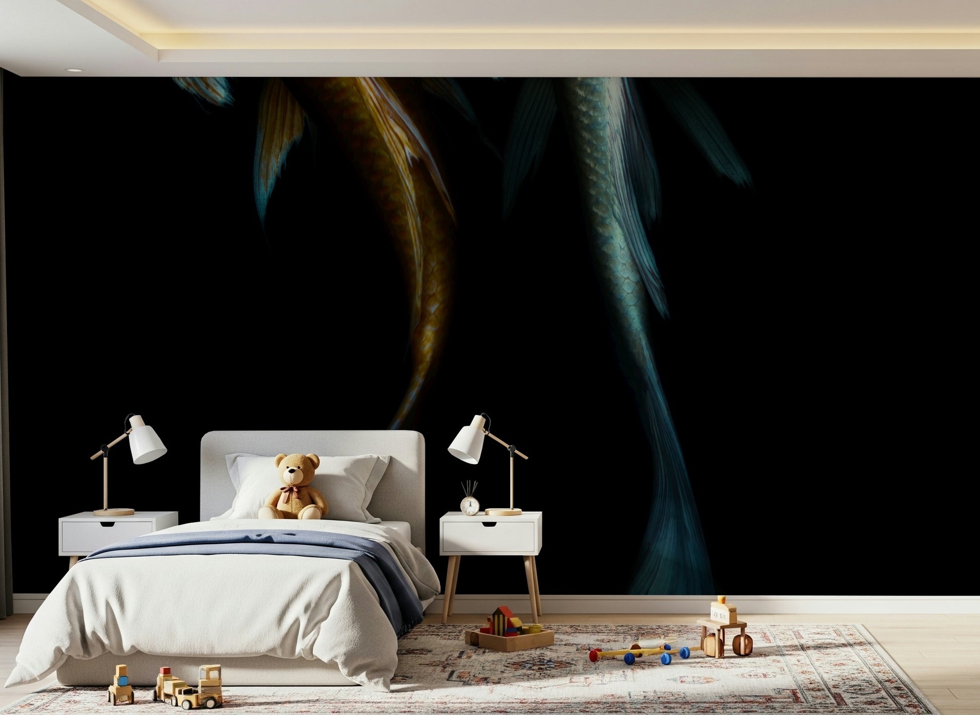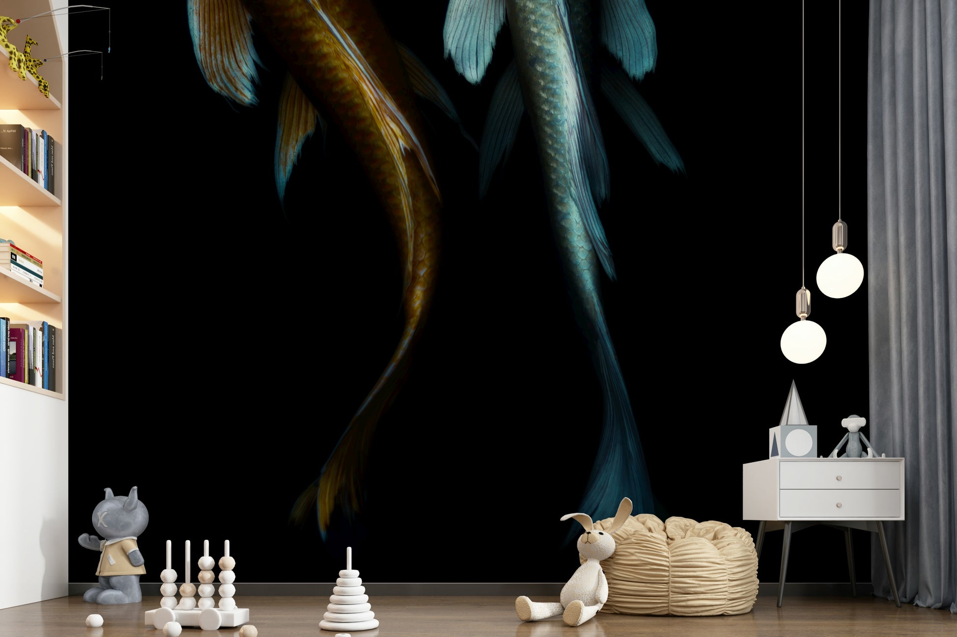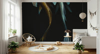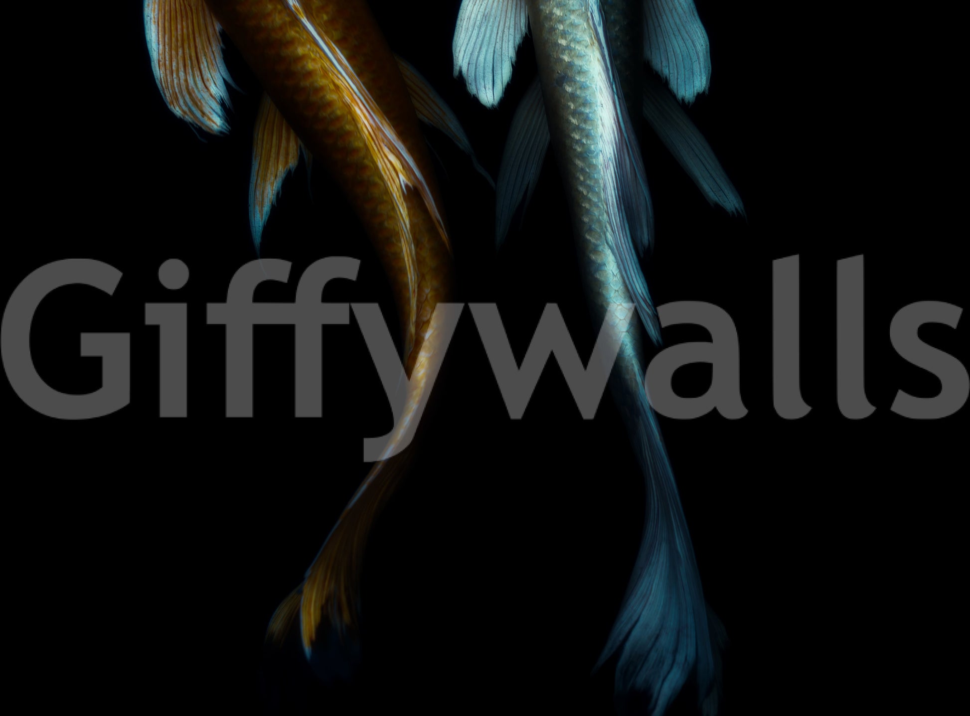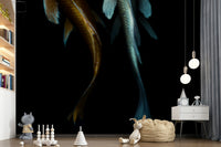 Immerse yourself in the mysterious depths with this arresting wallpaper. Two Koi fish, one a striking gold, the other a cool cyan, swim in an inky abyss. The high contrast design creates a captivating statement. Use this wallpaper for walls to craft a dramatic atmosphere in spaces like a study, dining room, or a unique feature wall. It infuses sophistication and an air of the unknown, enhancing any room's distinct character.