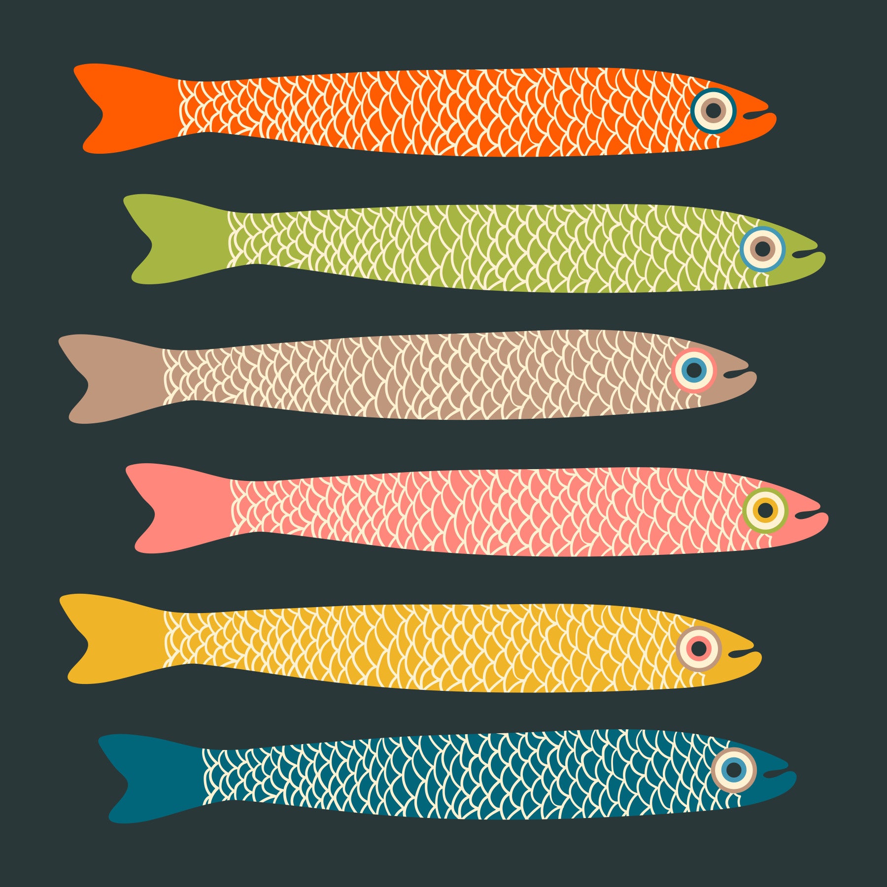 Playful retro fish mural with colorful anchovies on charcoal.