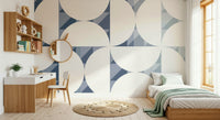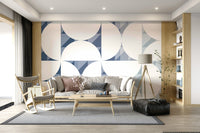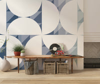 Invite a sense of order and calm with this patterned wallpaper. The design features crisp white semi-circles set against a background of geometric blue forms. This wallpaper brings a structured yet soothing aesthetic to spaces. Consider it for your office to promote focus or in a dining area for an elegant touch. Use this wallpaper for walls to improve the look of any room.