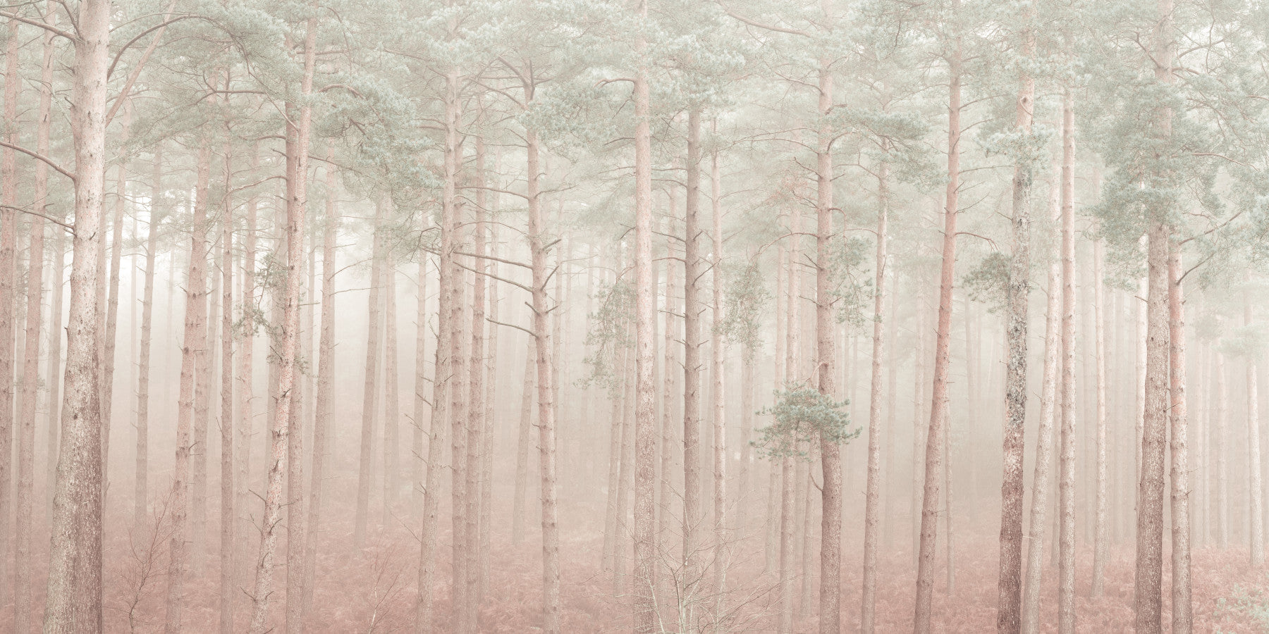 A wall mural of a misty woodlands scene.