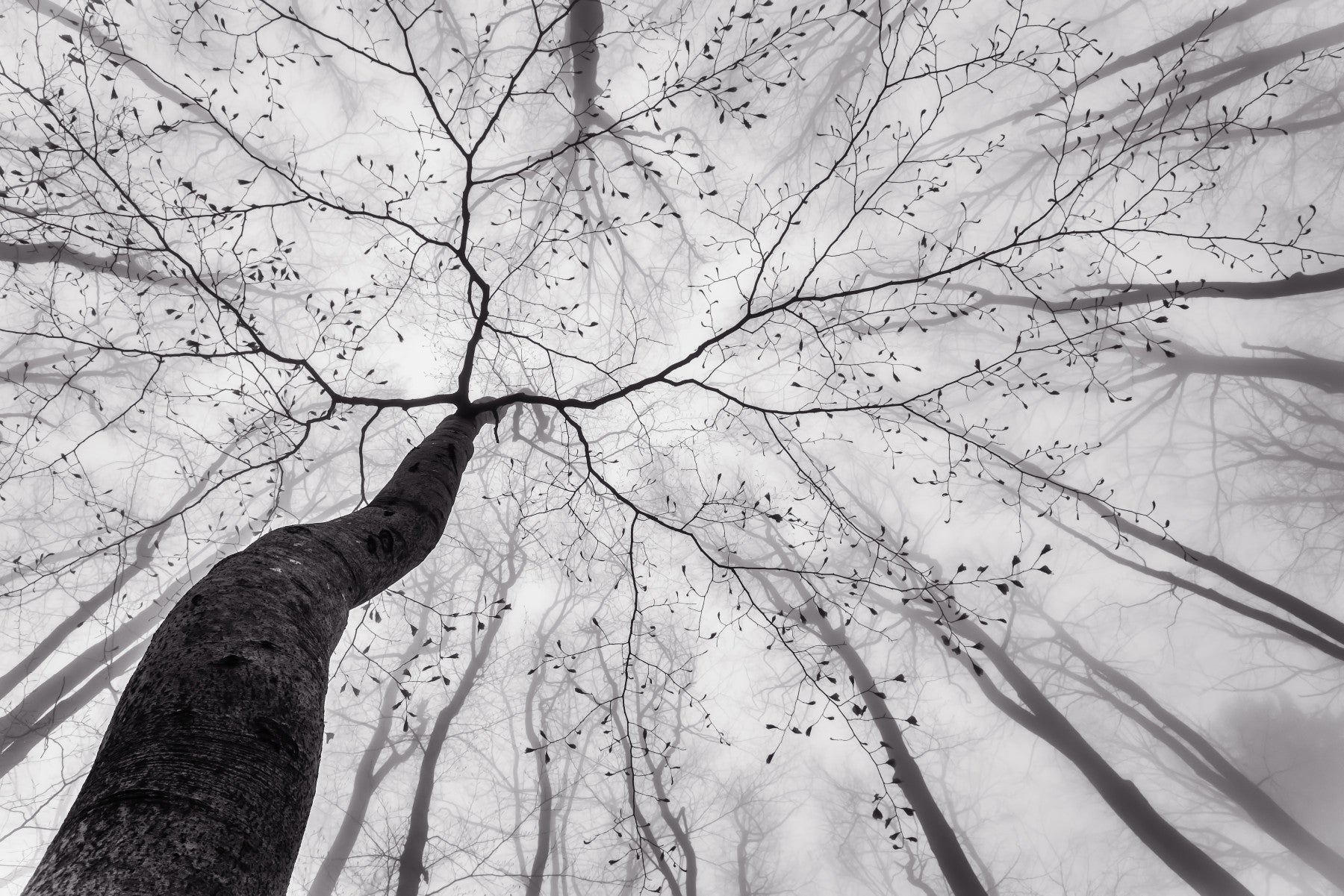 Elevate your interior with this ethereal forest-inspired wallpaper for walls. The captivating image shows bare trees reaching upward into a fog-filled sky, crafting a serene and spacious look. Ideal for a living room, bedroom, or office, the monochrome palette brings a touch of sophistication and calm. The design harmonizes well with modern, minimalist or rustic design, adding depth and a connection to nature. Experience a quiet, captivating escape every day.