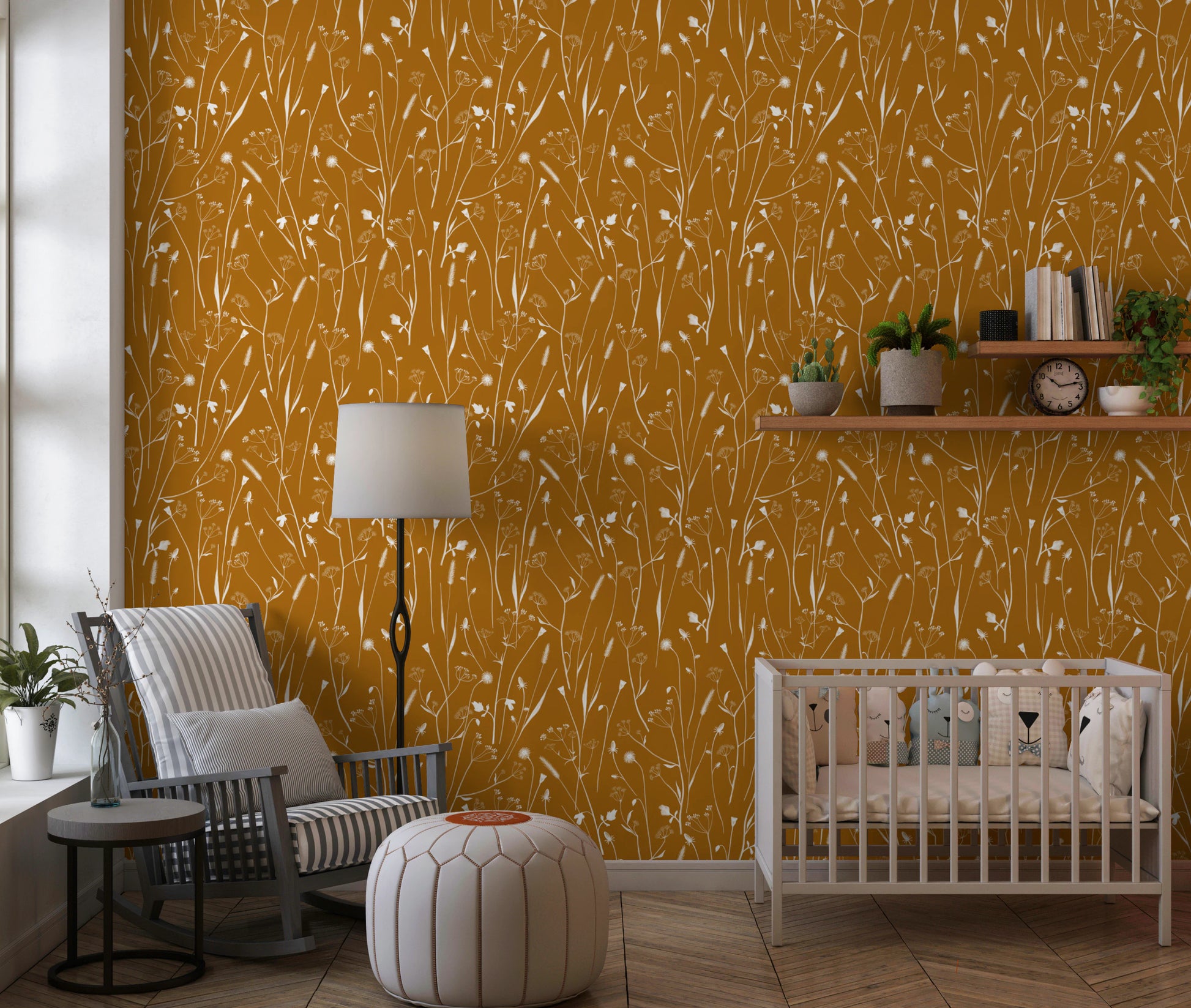 Framkalla en känsla av fridfull nostalgi med 'Homeland Floral Golden', en design som ger ditt vardagsrum värmen från soldränkta fält. Detta fängslande mönster har en delikat samling stiliserade vildblommor och gräs, återgivna i mjuka, krämiga vita nyanser mot en fyllig, gyllene bakgrund. Det subtila samspelet mellan ljus och skugga skapar en lugnande, organisk känsla, perfekt för att ge en touch av naturlig elegans till vilket rum som helst. Dess tidlösa skönhet gör den till ett mångsidigt val som sömlöst kompletterar både moderna och traditionella interiörer. Förvandla dina väggar till en duk av bestående stil med denna hyllning till enkel, pastoral skönhet.