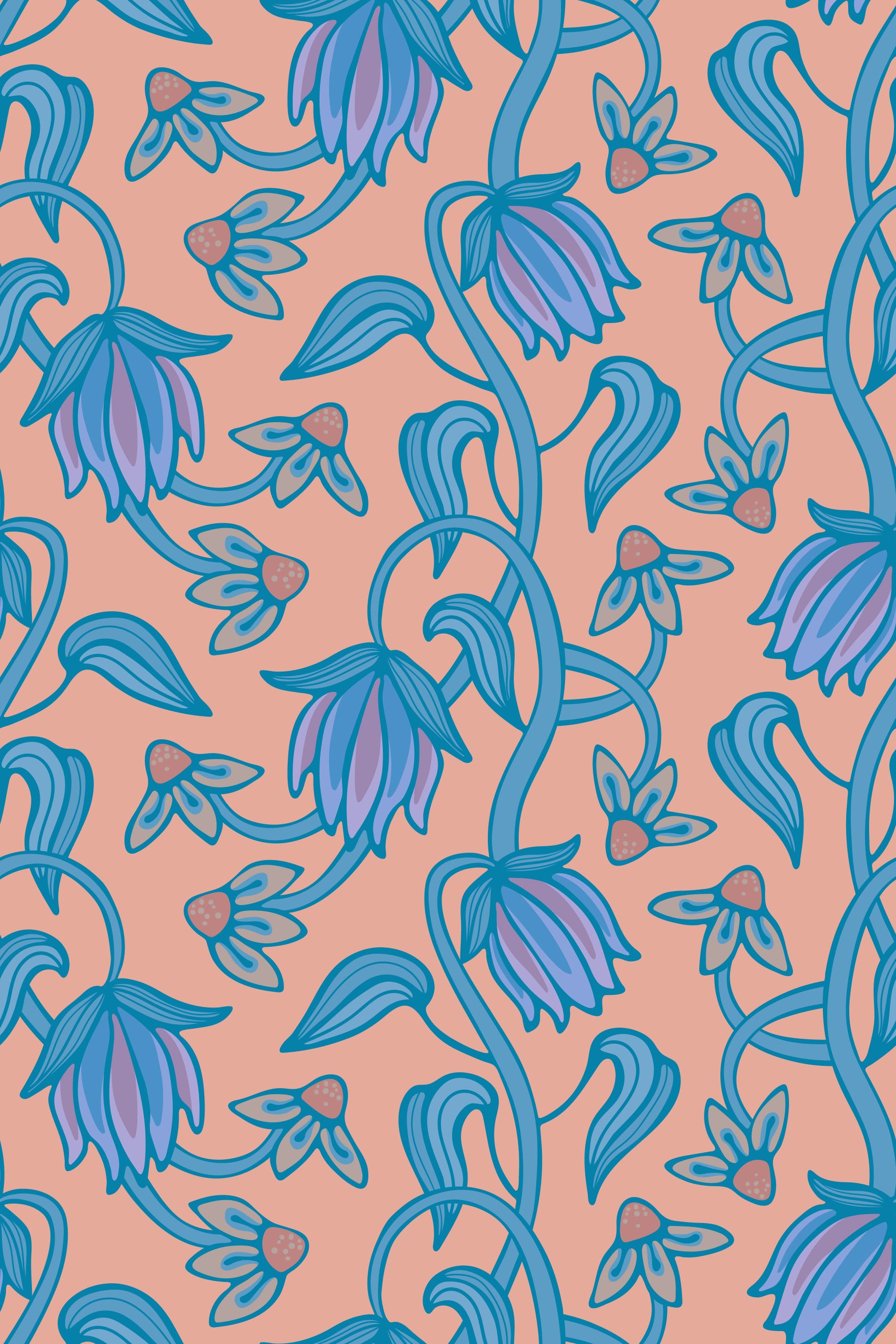 Underbar bohemisk blommig botanisk design som slingrar sig och flätas med fullt utslagna moderna blommor och blad! I varma, klara Boho Chic-färger: nyanser av blått, lila och varma neutrala toner på blush-orange! Somrig, fräsch och strandchic med en stil som påminner om jugendstil! Detta tapetmönster finns även i andra färgställningar. Original tapetmönster designat av Jackie Tahara från UnBlink Studio.