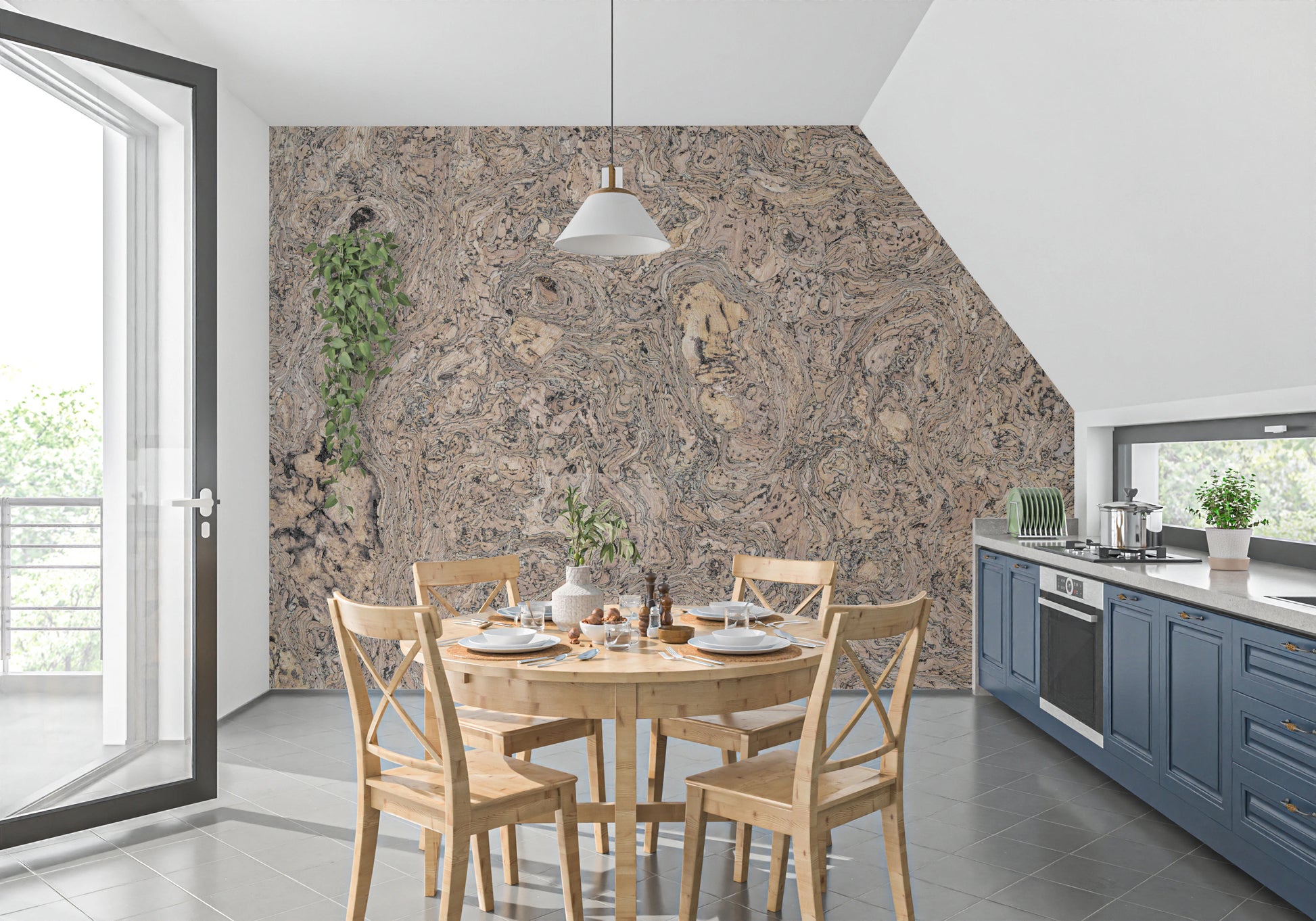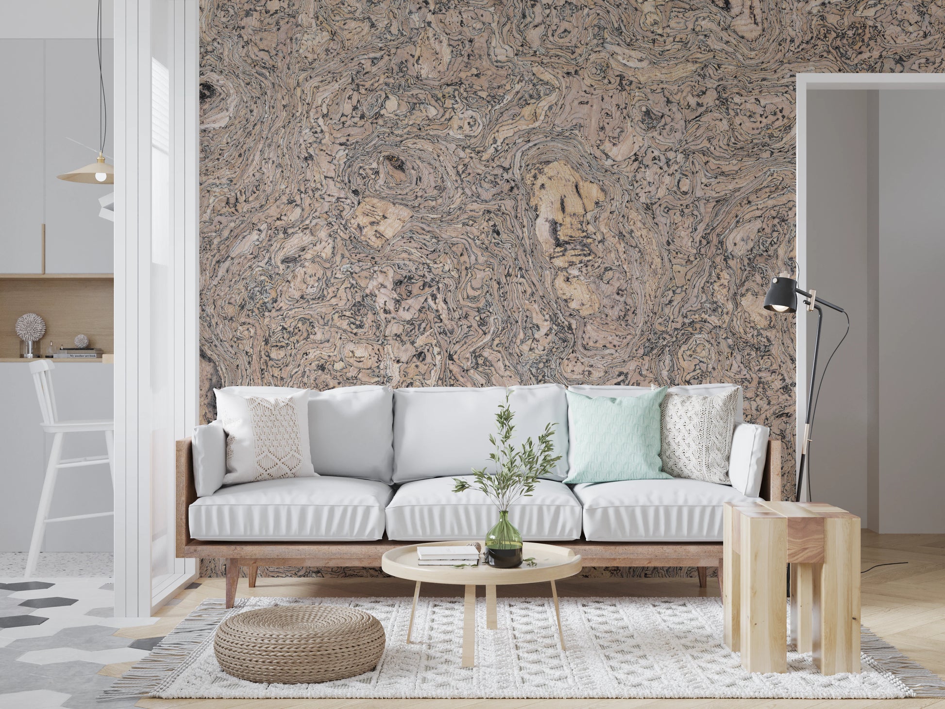 Helbild av korkmatta i bakgrunden. Omfamna naturens diskreta elegans med "Organic Cork Grain Flow", en sofistikerad väggdekor som tar in korkens råa skönhet i ditt vardagsrum. De invecklade, virvlande mönstren i korkådringen skapar en fascinerande visuell textur som efterliknar vattnets graciösa flöde eller jordens organiska konturer. Varma, jordnära toner smälter sömlöst samman och erbjuder en jordande och lugnande effekt, perfekt för att skapa en lugn och inbjudande atmosfär. Denna design hyllar de inneboende ofullkomligheterna och unika variationerna som finns i naturmaterial och erbjuder en visuell upplevelse som är både fängslande och tröstande. Låt de subtila detaljerna och den organiska charmen i denna design ge din interiör värme och karaktär och förvandla dina väggar till en duk av naturlig konstnärlighet. Den inbjuder till en känsla av lugn, perfekt för sovrum, vardagsrum eller alla områden som söker en touch av diskret naturlig lyx.