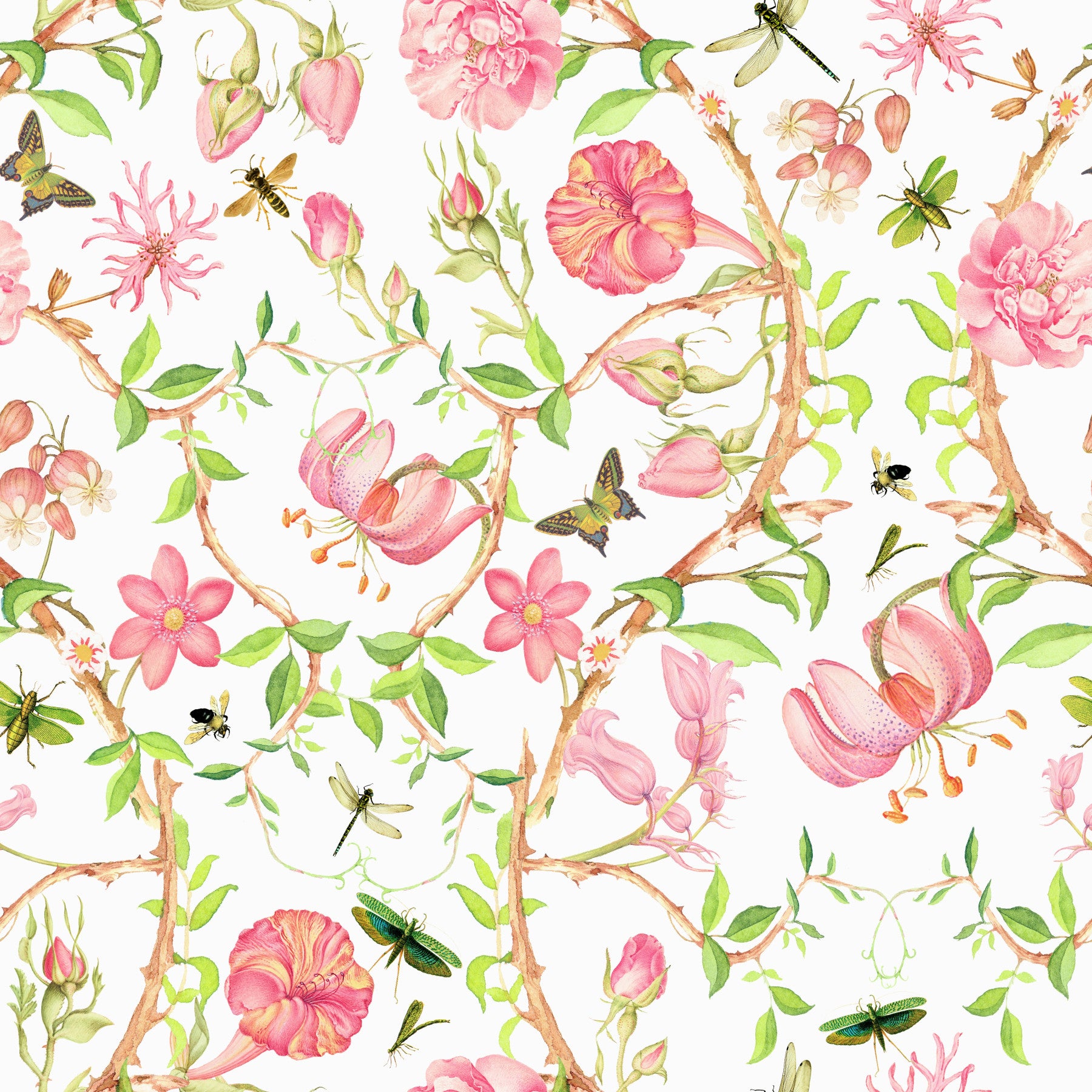 Fördjupa dig i en värld av känslig skönhet med denna fantastiska tapet. Ett hisnande utbud av rosa rosor, liljor och andra vilda blommor, som görs i utsökta akvarelldetaljer, skapar en livlig men ändå lugn scen. Det sömlösa mönstret accentueras av charmiga fjärilar och sländor och lägger till ett element av lekfull sofistikering. Den mjuka rosa paletten och känsliga konstverk gör det idealiskt för att skapa en lugn och romantisk atmosfär i sovrum, vardagsrum eller något utrymme som kräver en touch av elegant kvinnlighet. Denna tapet utstrålar en känsla av känslig skönhet och lägger till en touch av paradiset till ditt vardagsrum.