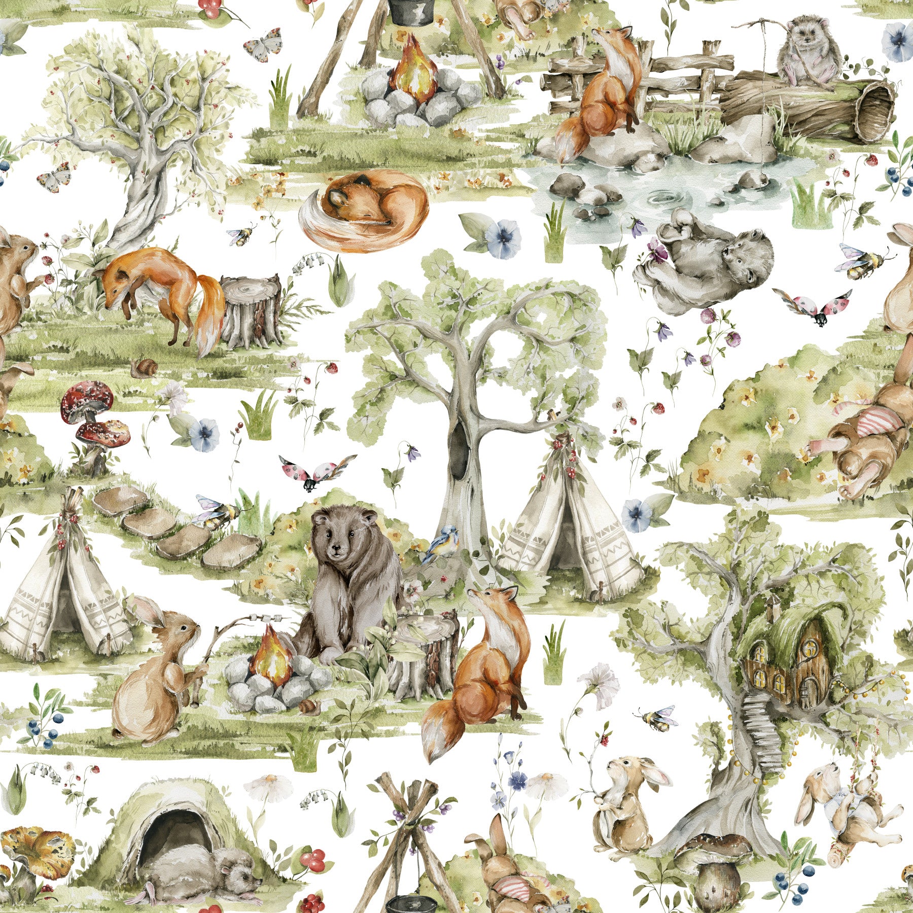 Immerse yourself in a charming forest scene with this delightful wallpaper for walls by Uta Naumann. Watercolor-style illustrations bring adorable animals like foxes, bears, and rabbits to life amidst cozy campsites and whimsical treehouses. A soft color palette of greens, browns, and gentle floral accents creates a serene and playful atmosphere. This design particularly complements nurseries, children's rooms, and playrooms, offering a unique backdrop for imagination and adventure. The seamless pattern ensures a smooth, continuous look, enhancing the room's overall ambiance with a touch of nature's enchantment. Invite the spirit of the woodlands into your home with this heartwarming design.